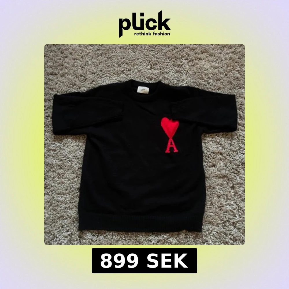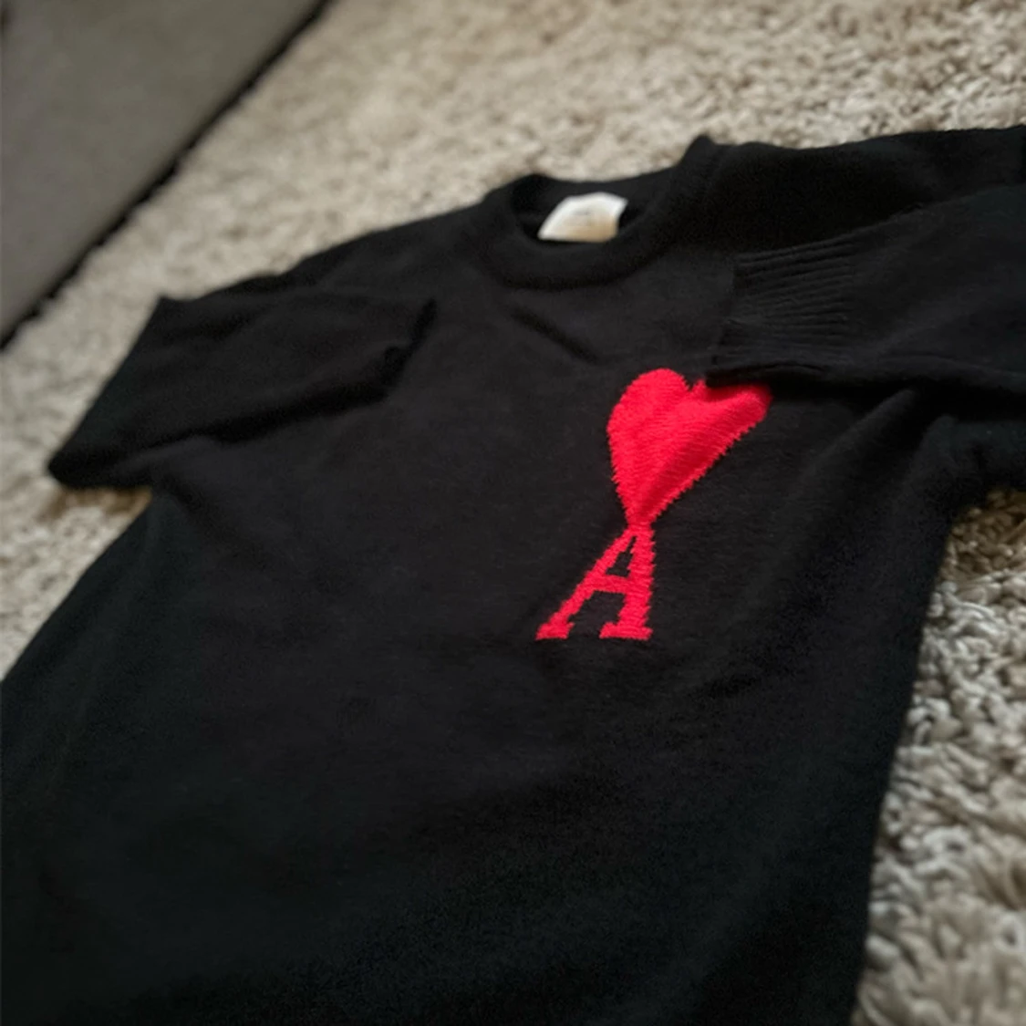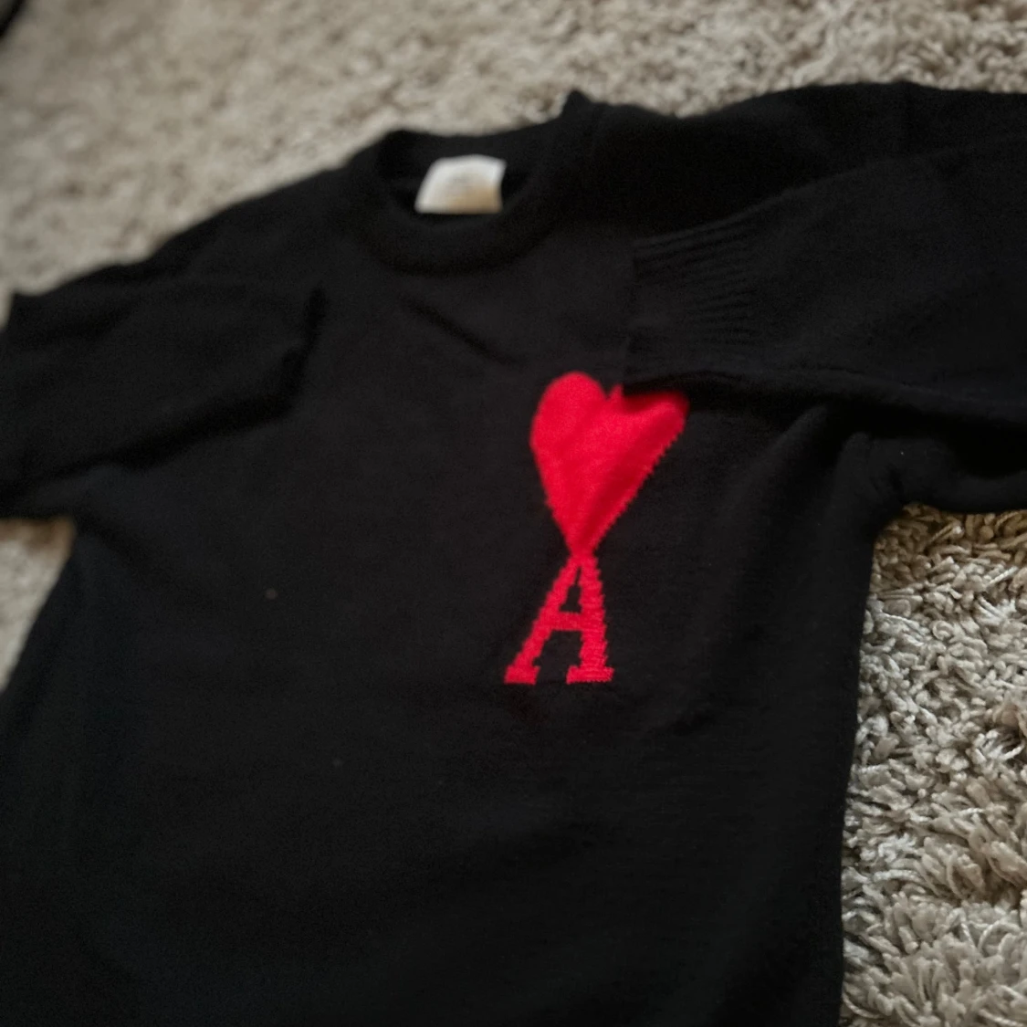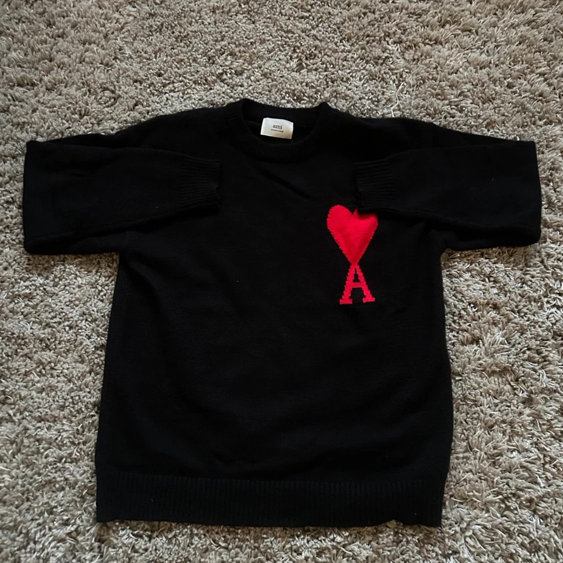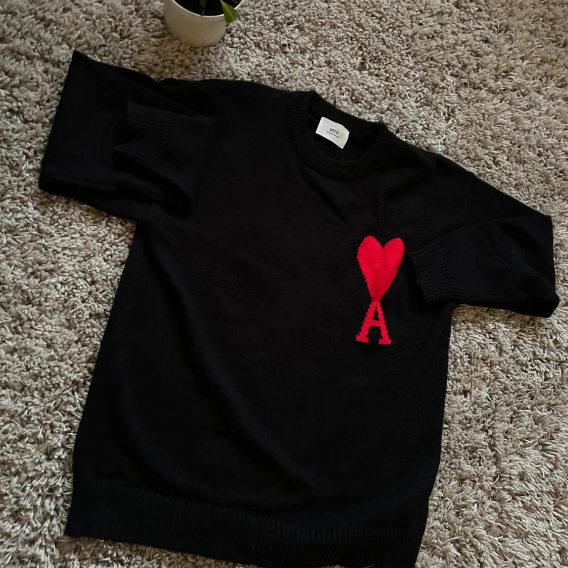 Svart stickad tröja AMI med ett stort rött hjärta ❤️och bokstaven A broderat på bröstet. Tröjan har rund hals, ribbade muddar och långärmad passform🧵Perfekt för dig som gillar stilrena detaljer med en twist | Storlek är S 🙈