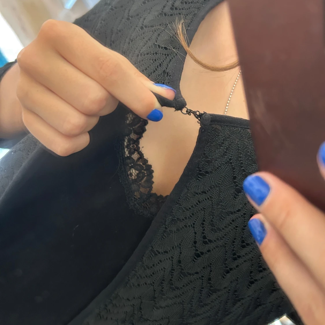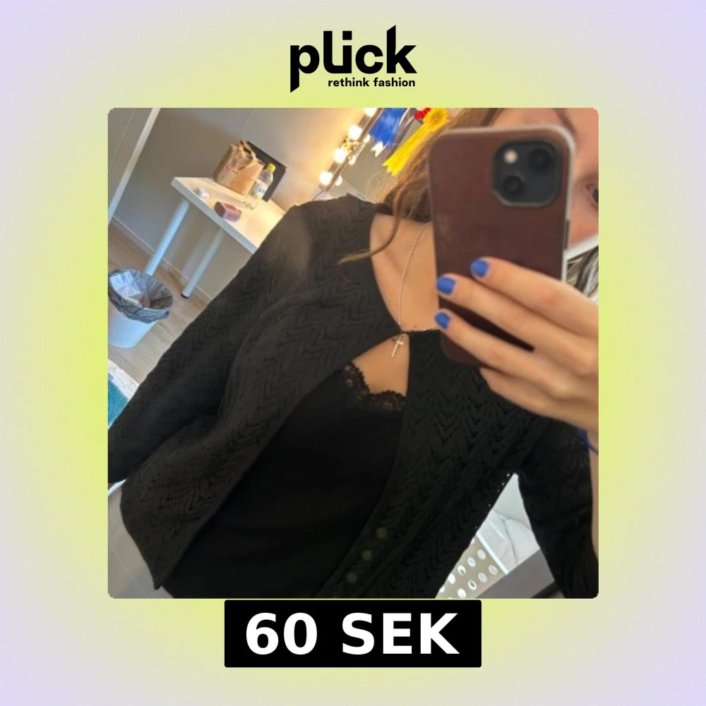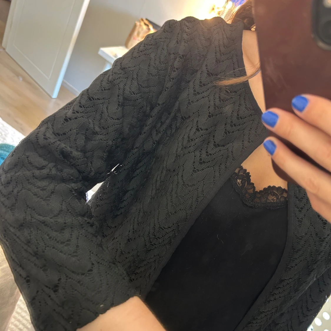 Säljer en svart trekvarts ärmad cardigan jacka med snyggt hålmönster och diskret knäppning. Det står tyvärr inte märke eller storlek men skulle gissa på s/m