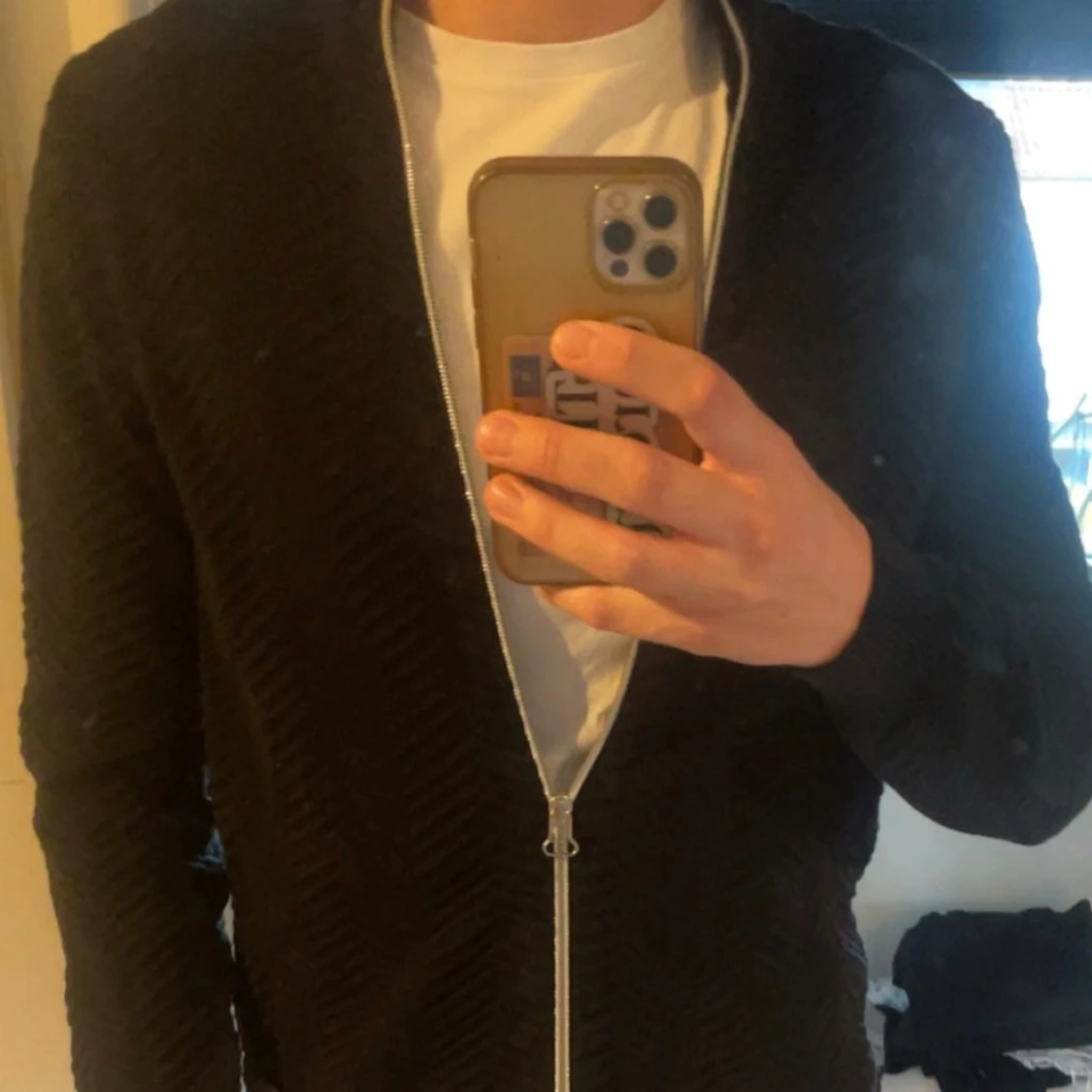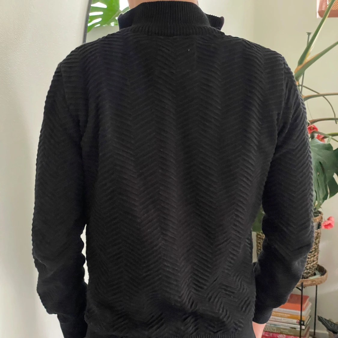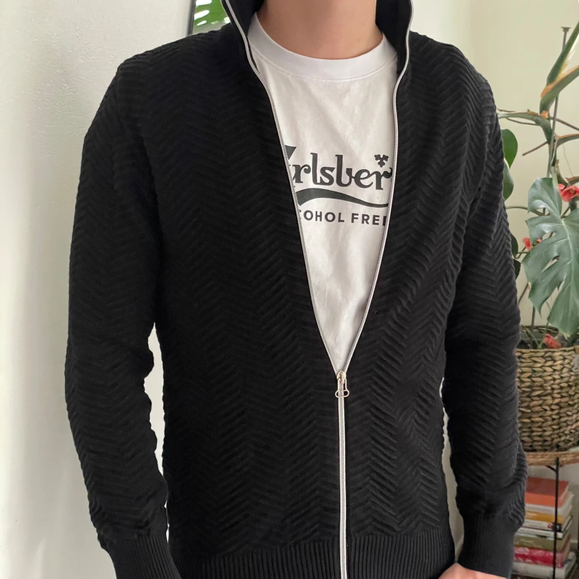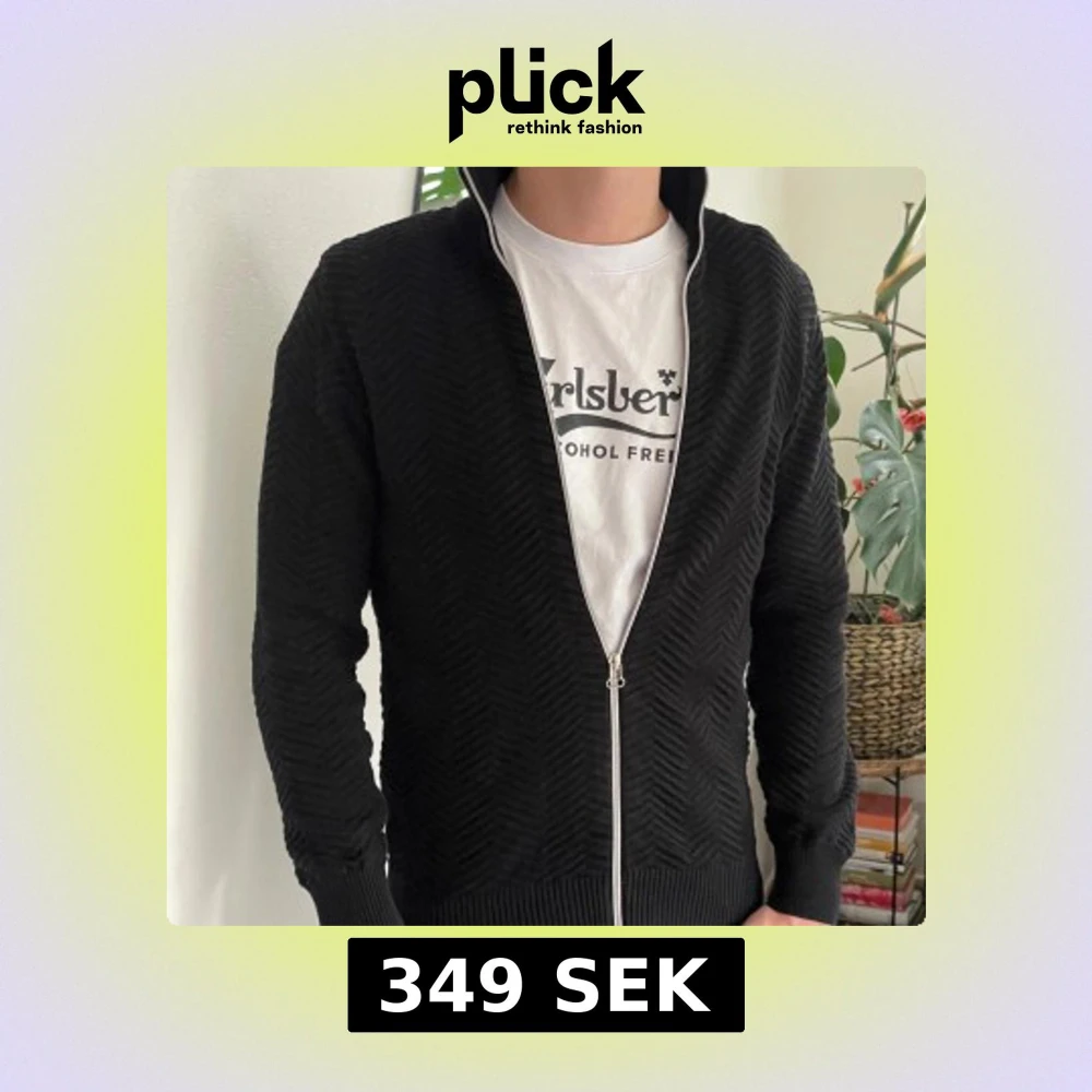 Svart stickad cardigan jacka med snyggt diskret mönster och hel dragkedja framtill. Hör av er vid frågor och funderingar, skick 9/10!