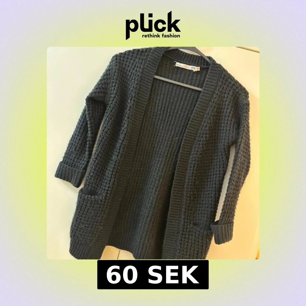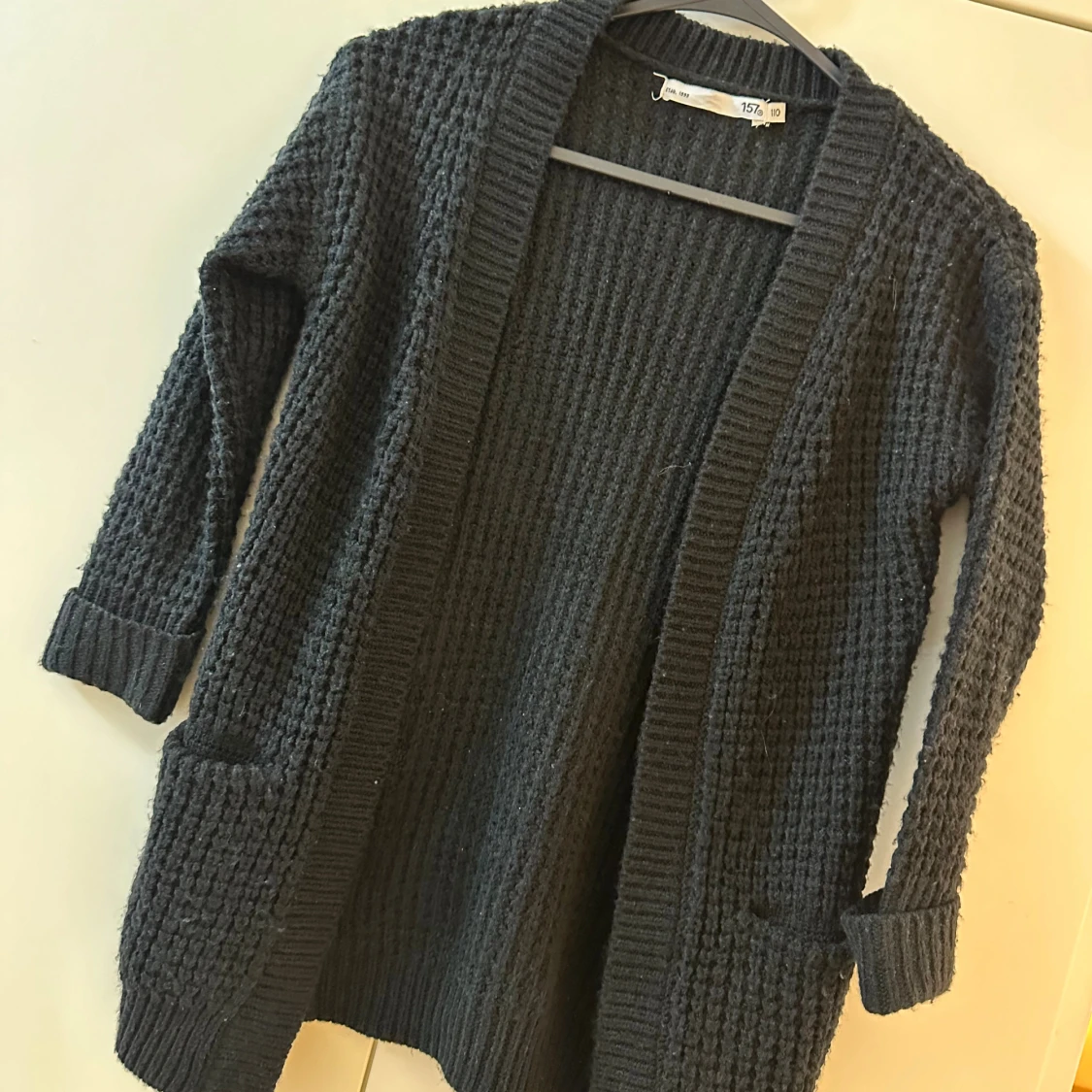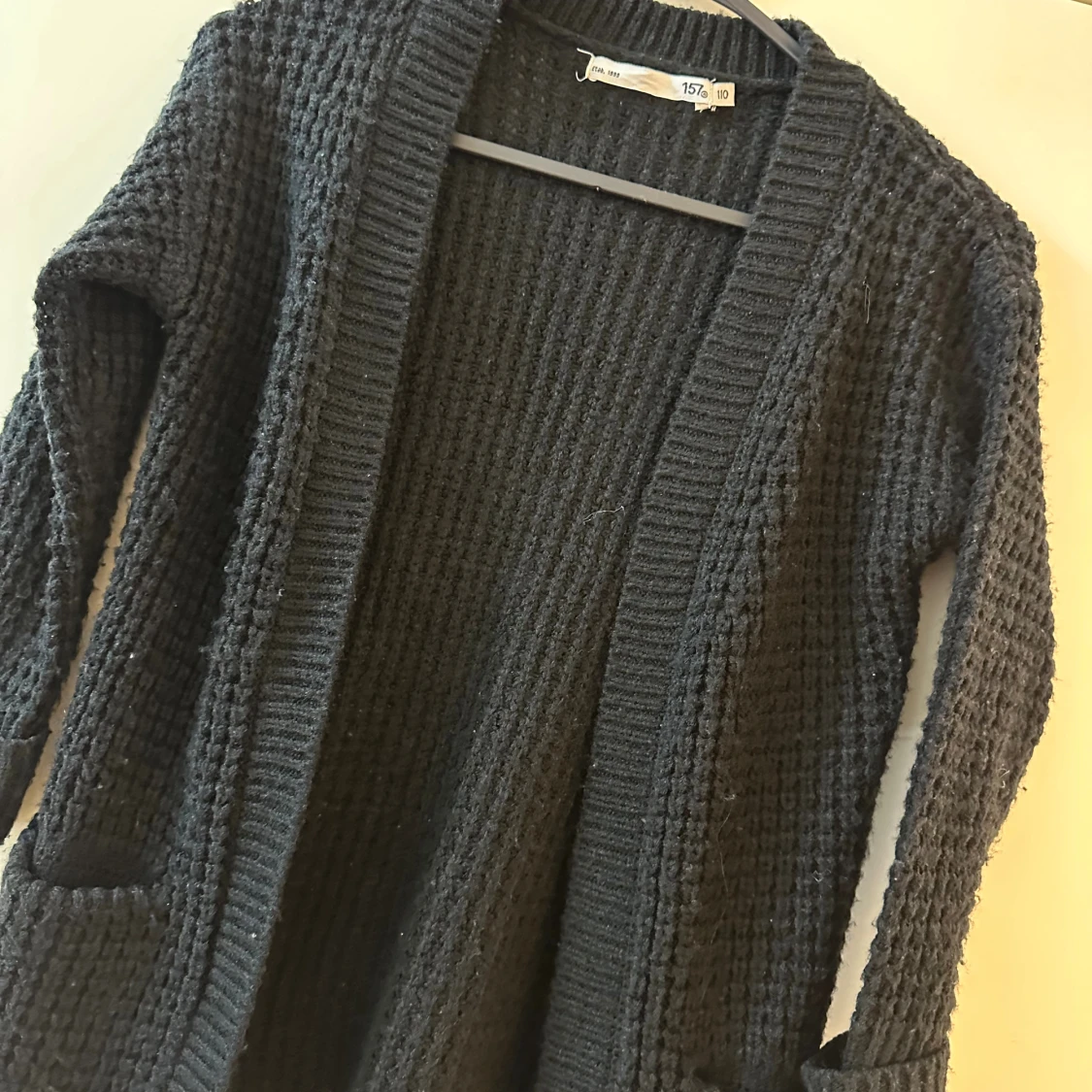 Mysig svart stickad kofta från 157 med grovstickad struktur, långa ärmar och två fickor framtill. Perfekt att slänga på sig när det är kyligt ute. Koftan har en öppen front och bred ribbad kant längs öppningen.