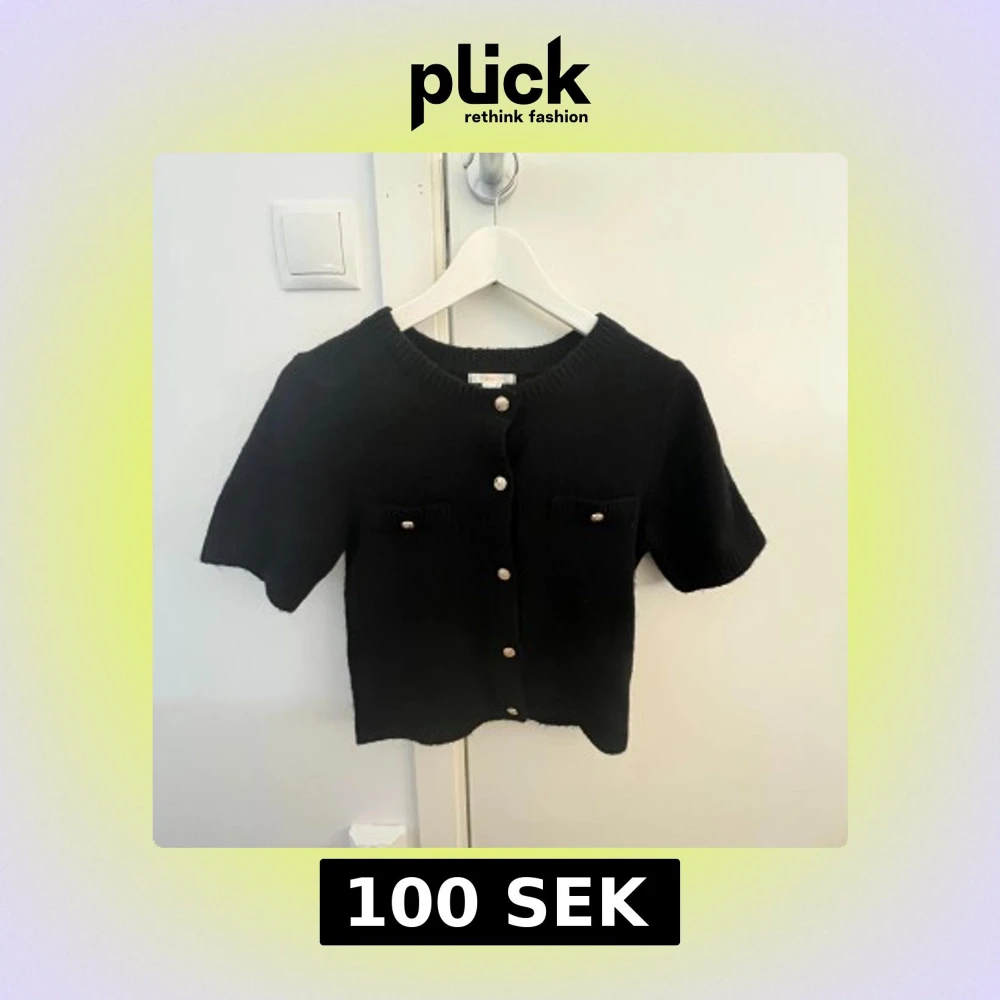 Säljer en svart stickad kofta från Gina Tricot med korta ärmar och dekorativa guldknappar framtill. Koftan har två små fickor på bröstet och ribbade kanter. Perfekt att styla till olika outfits!