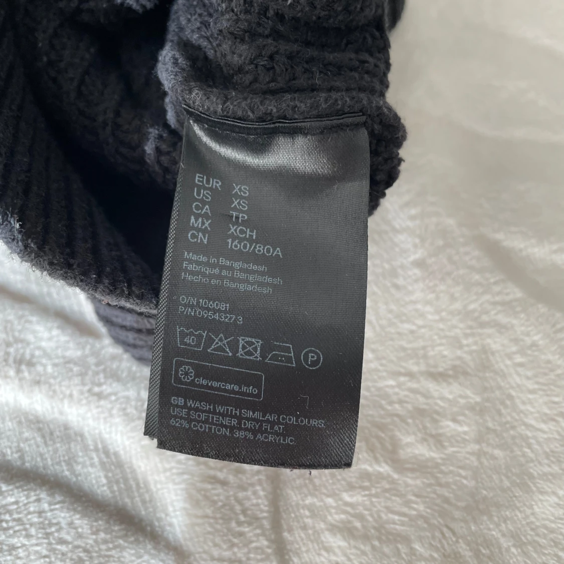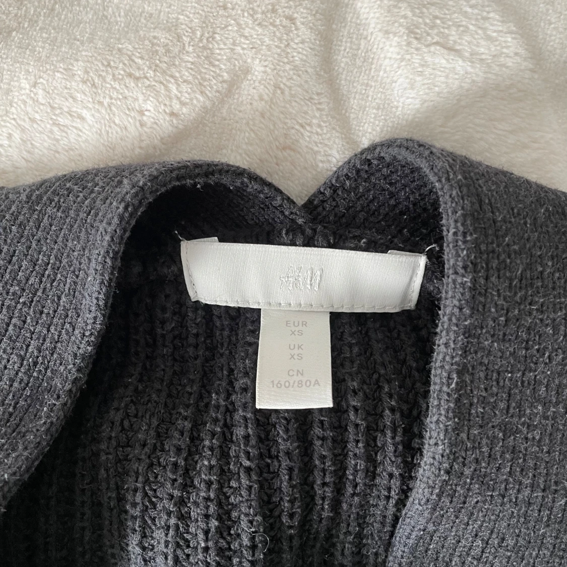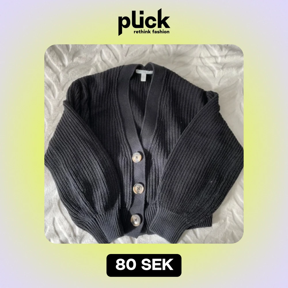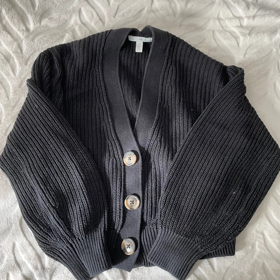 Säljer en snygg svart stickad kofta från H&M. Den har en klassisk design med stora knappar framtill och ribbade detaljer. Perfekt för höst och vinter, och den är mysig och bekväm att ha på sig. Passar både till vardags och lite finare tillfällen.
