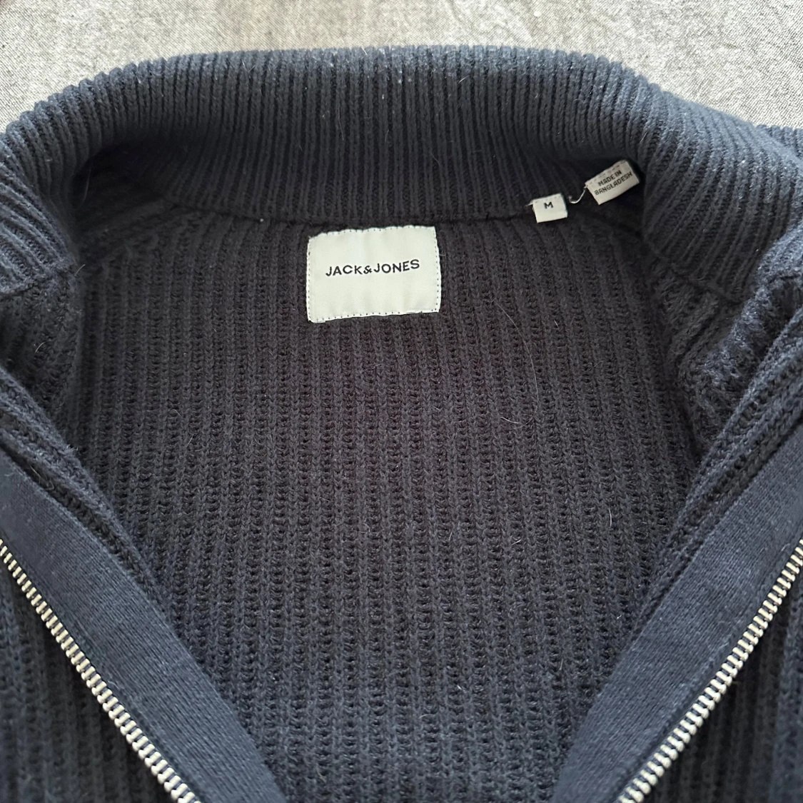 Säljer en stilren blå stickad kofta från Jack & Jones. Koftan har en praktisk dragkedja framtill och ribbade detaljer vid krage och ärmslut. Perfekt för kyliga dagar. Storlek M