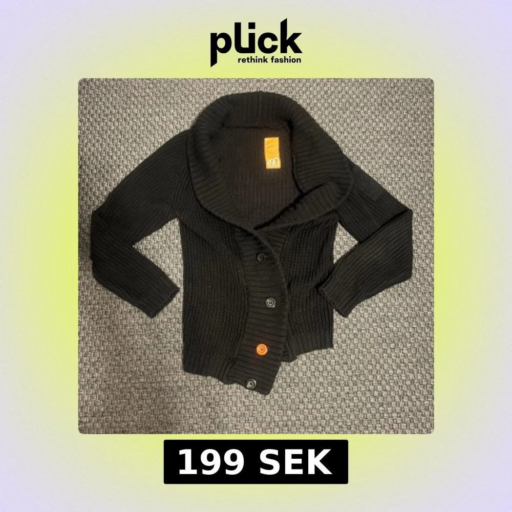 Svart ribbstickad kofta från Mouli med bred krage och fyra knappar framtill, varav en är orange för en cool detalj. Långärmad och i grovstickad bomull, perfekt för lager-på-lager. Modern Urban Lifestyle-märke på ärmen. Sitter rätt långt så passar runt m skulle jag säga! Inga defekter!