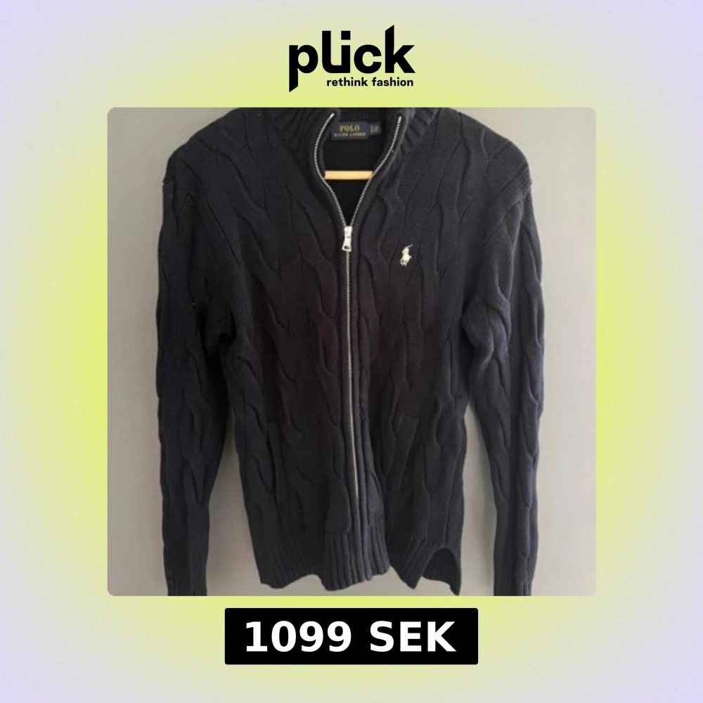 Kabelstickad svart kofta från Polo Ralph Lauren med dragkedja framtill och klassisk logga broderad på bröstet. Tröjan har hög krage, långa ärmar och ribbade muddar. Perfekt för dig som gillar stilren och tidlös design.