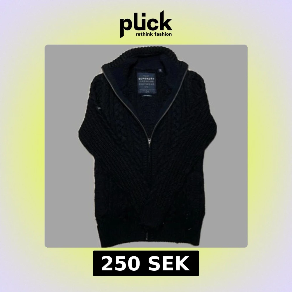 Säljer en svart stickad kofta från Superdry med dragkedja framtill. Koftan har ett snyggt flätmönster och hög krage, perfekt för kyliga dagar. Den är långärmad och har ribbade muddar vid ärmslut och nederkant.
