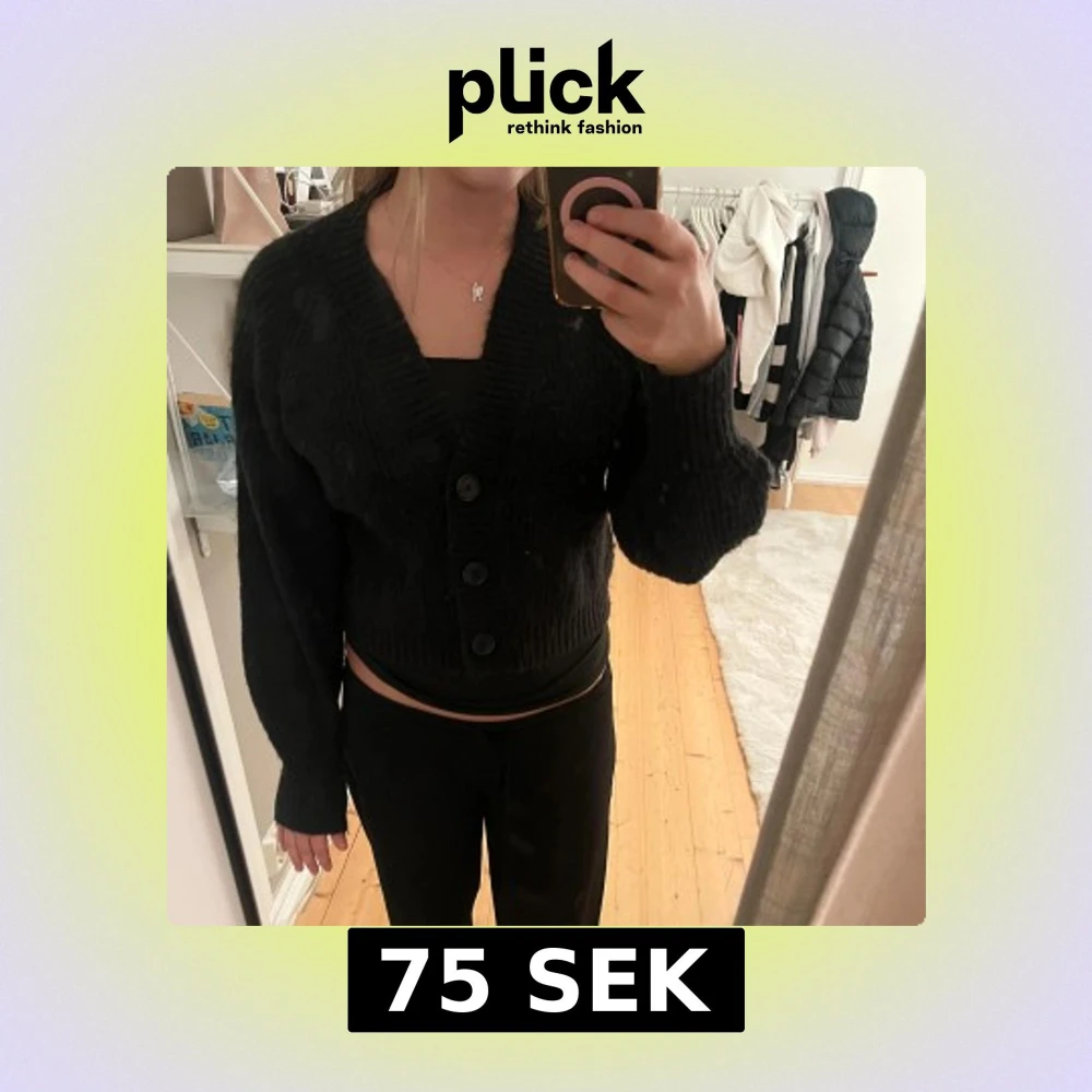 Svart, croppad stickad kofta från Gina Tricot med tre stora knappar framtill och djup v-ringning. Koftan har långärmade, lite loose ärmar och bred ribbad kant vid hals och nederdel. Perfekt för dig som gillar chill och stilren vibe.