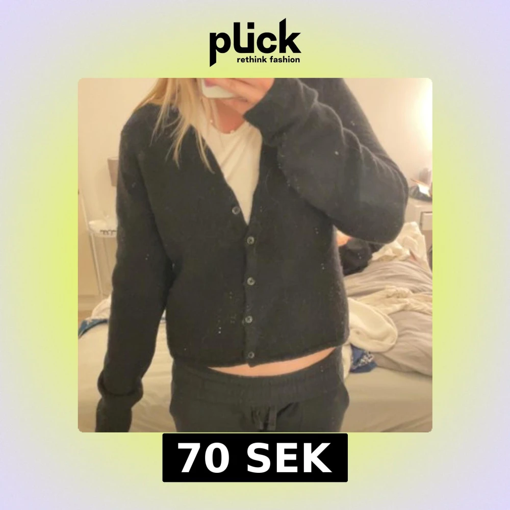Säljer en svart stickad kofta med rund halsringning och knäppning framtill. Koftan är croppad och har långa ärmar, perfekt att slänga över en t-shirt eller linne. Enkel och stilren design som funkar till det mesta. Väldigt liten i storlek!