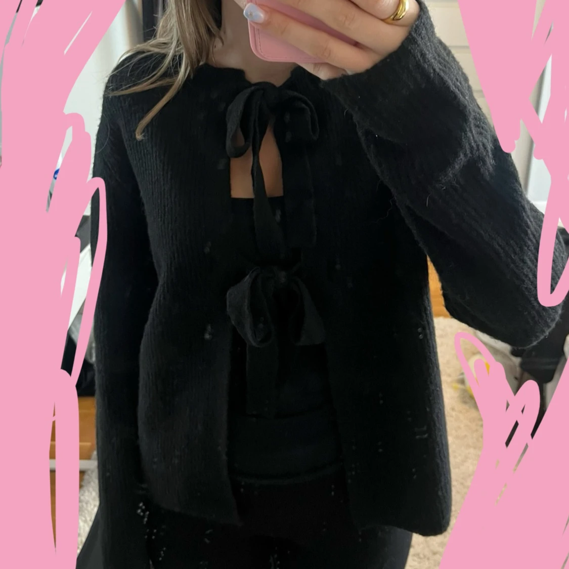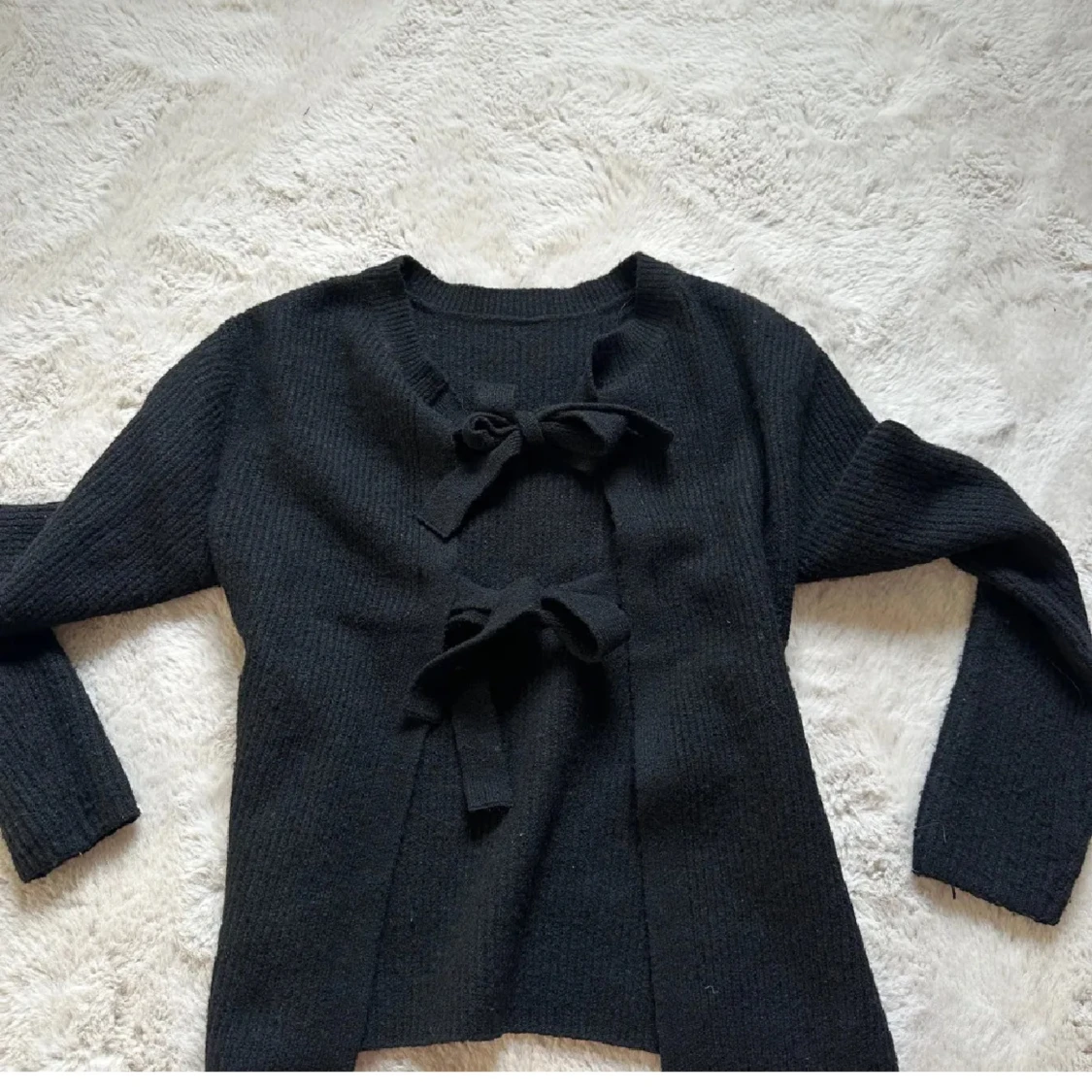 Trendig svart stickad kofta med croppad passform och långa ärmar. Koftan har snygga knytband framtill och baktill som ger en öppen känsla både fram och bak. Perfekt för dig som vill ha en unik och stilren look.
