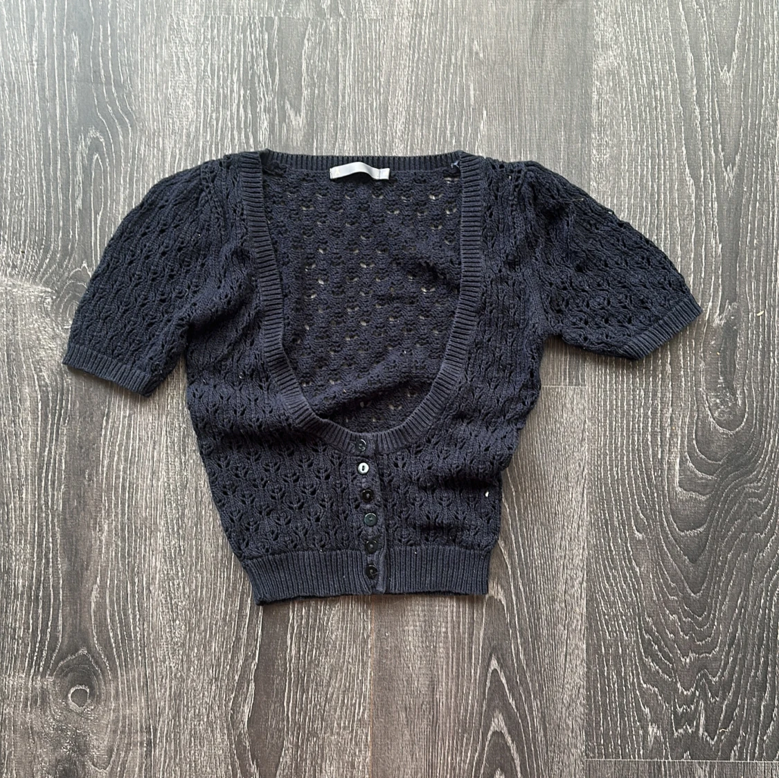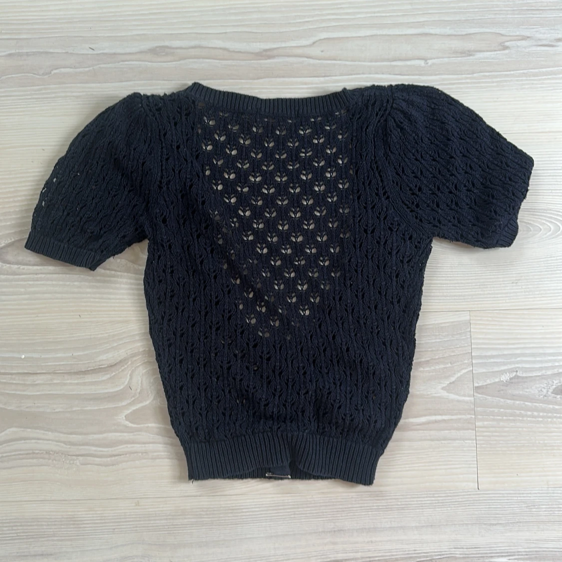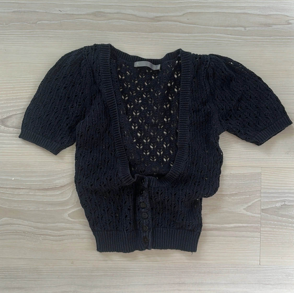 Kort svart stickad kofta med djup v-ringning och fina hålstickade detaljer. Koftan har korta ärmar, ribbade muddar och knappar framtill. Perfekt att slänga över ett linne eller klänning för en chill look.