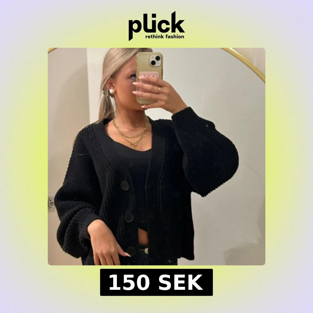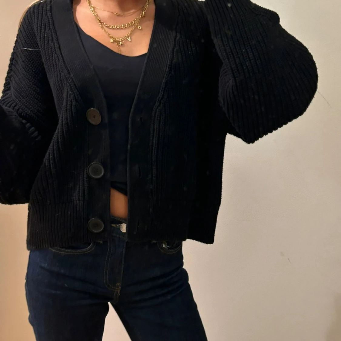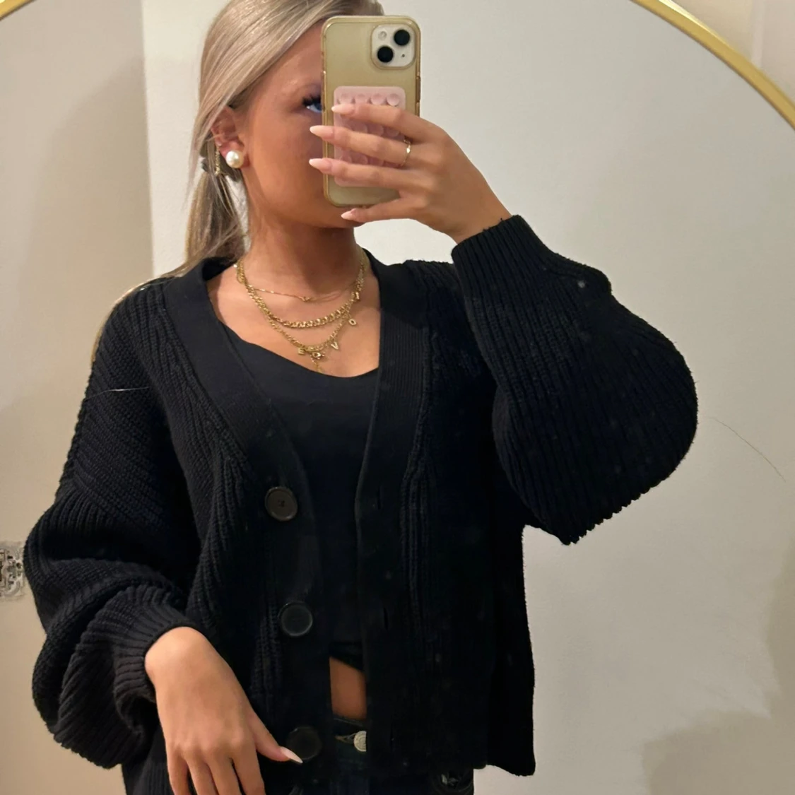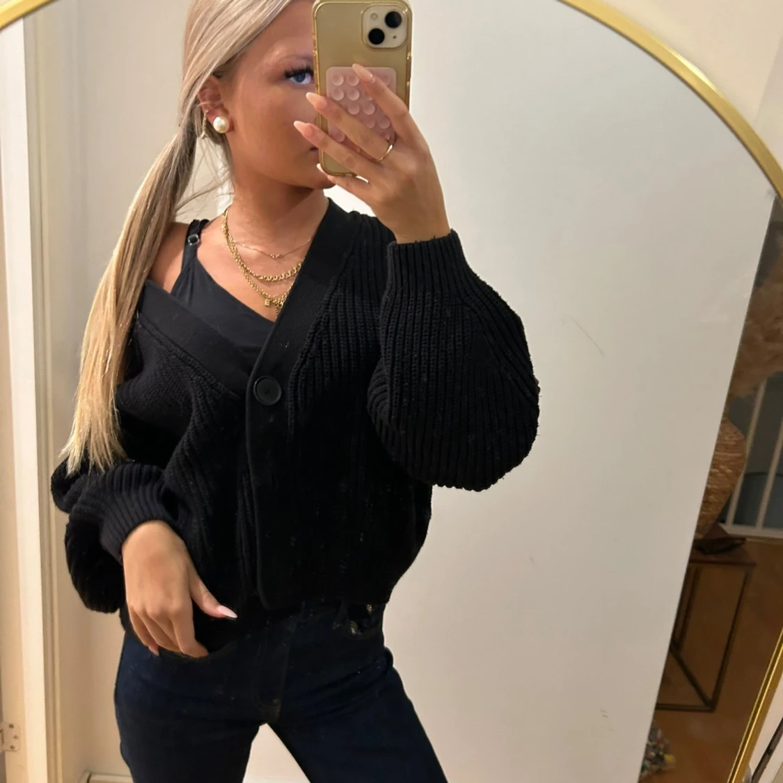 Säljer en svart stickad kofta med oversized passform och stora, runda knappar framtill. Koftan har breda, ribbade muddar och långärmade ballongärmar som ger en cool och avslappnad vibe. Perfekt att slänga över en topp för en snygg lager-på-lager-look.