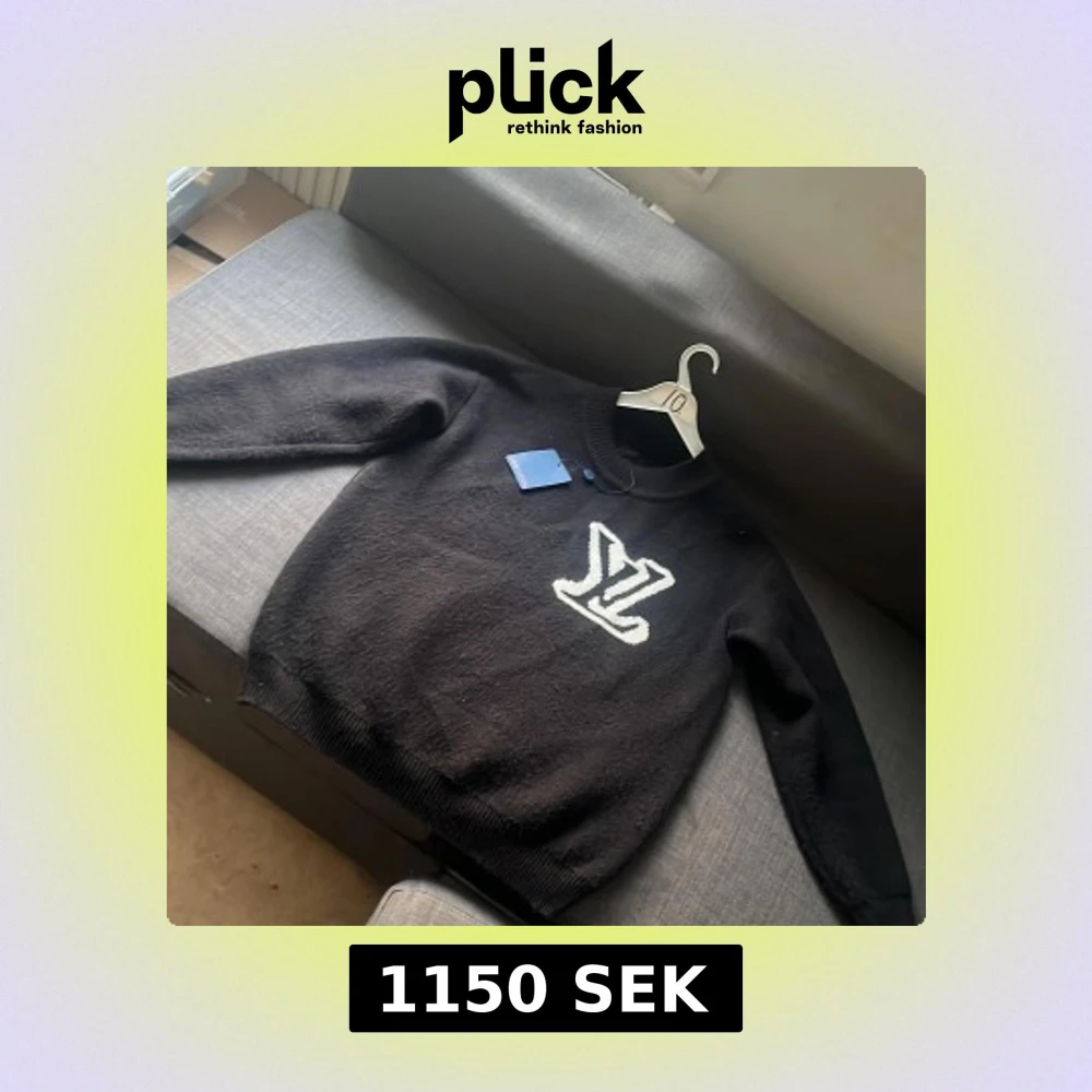 Svart stickad tröja från Louis Vuitton med stort vitt LV-logo framtill. Rund hals och ribbade muddar vid ärmslut och nederkant. Perfekt för dig som gillar exklusiva märken och vill ha en clean look med tydlig branding.