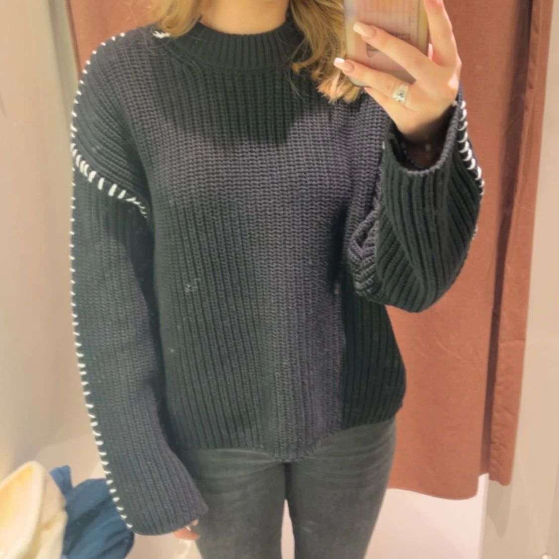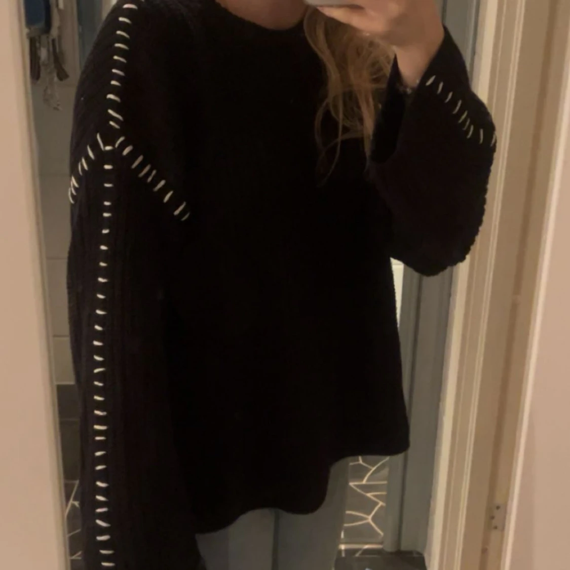 Mysig svart stickad tröja från Gina Tricot i storlek XS. Tröjan har grov ribbstickning och coola vita sömdetaljer längs ärmarna och axlarna. Långärmad och med avslappnad passform, perfekt för lager-på-lager under kyliga dagar. Storlek xs men mer som en s 💕använd men bra skick