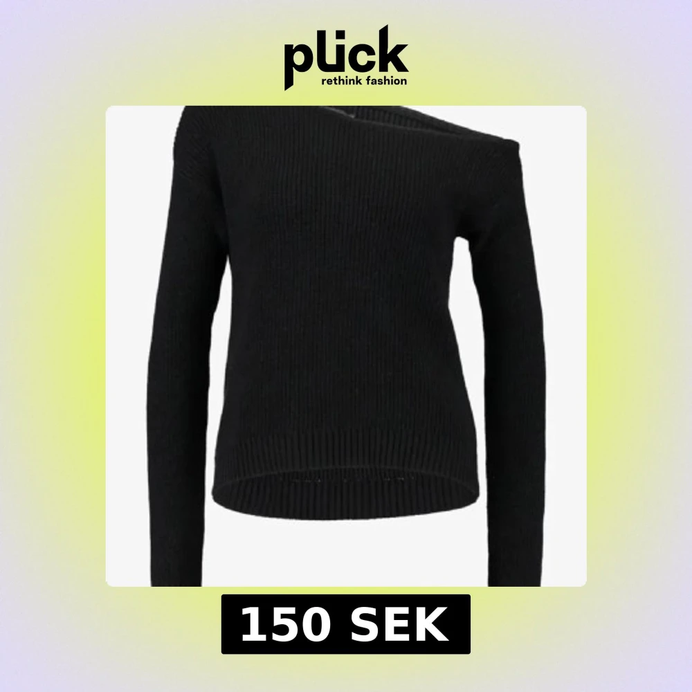 Snygg svart stickad tröja med offshoulder-design och lång ärm. Ribbad struktur som ger en cool och modern känsla. Perfekt att matcha med jeans för en avslappnad men trendig look.