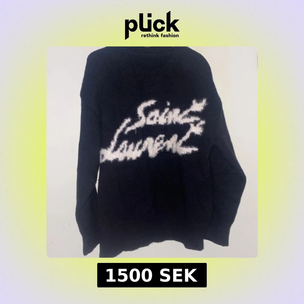 Säljer en svart stickad tröja från Saint Laurent med vit, fluffig logga framtill. Tröjan har rund hals och långa ärmar, perfekt för dig som gillar statement-plagg och exklusiv streetstyle.