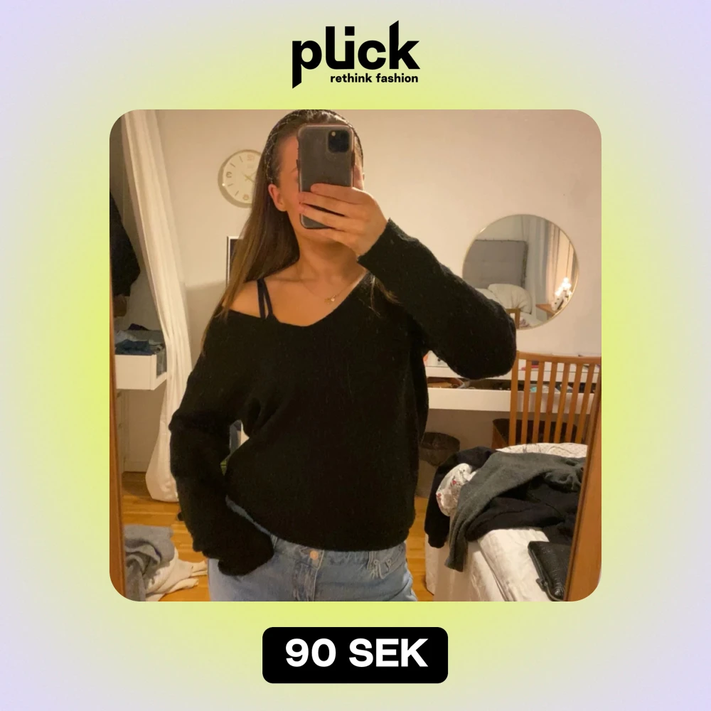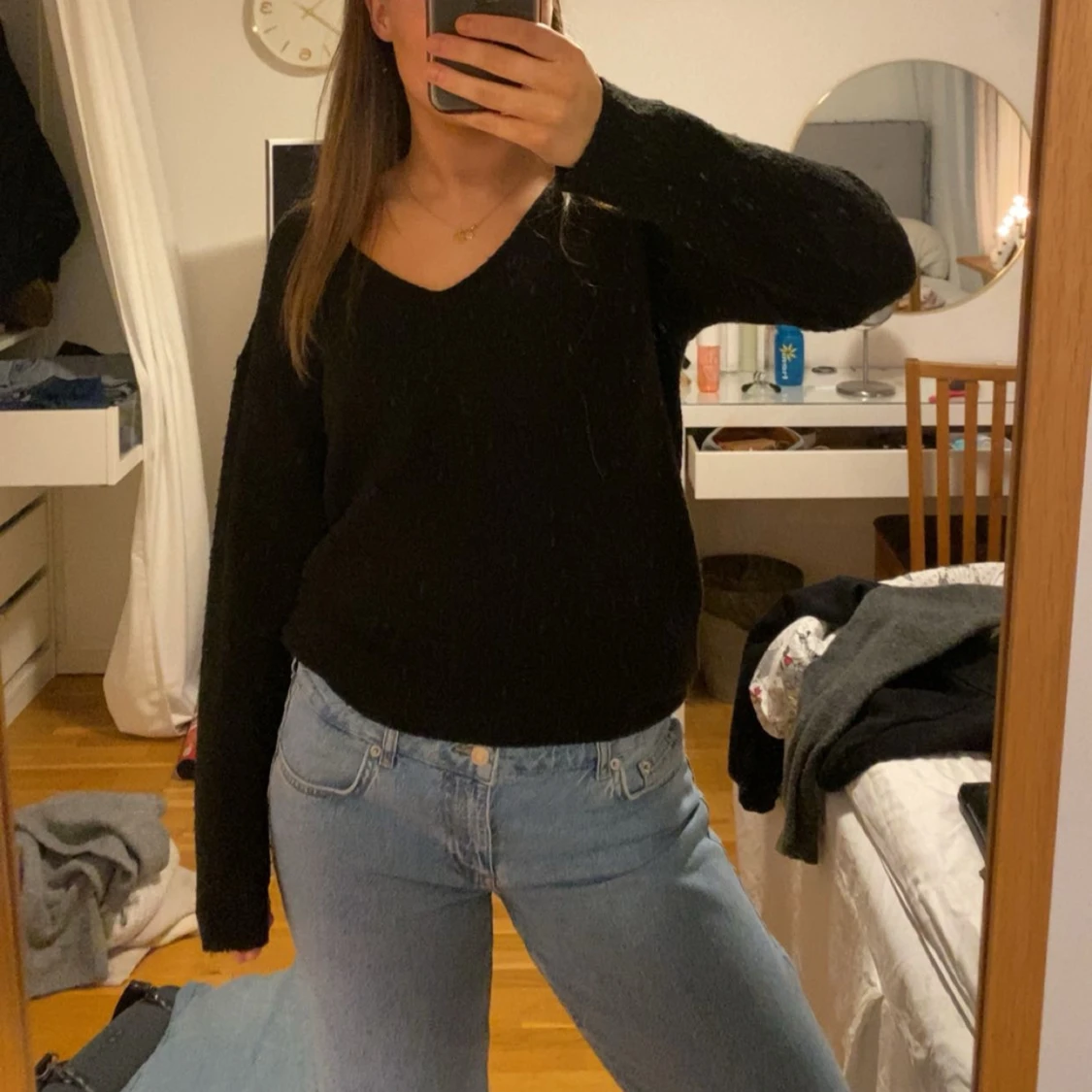 Säljer en svart stickad tröja med v-ringning och långa ärmar. Perfekt för kyligare dagar och lätt att matcha med jeans eller kjol.
