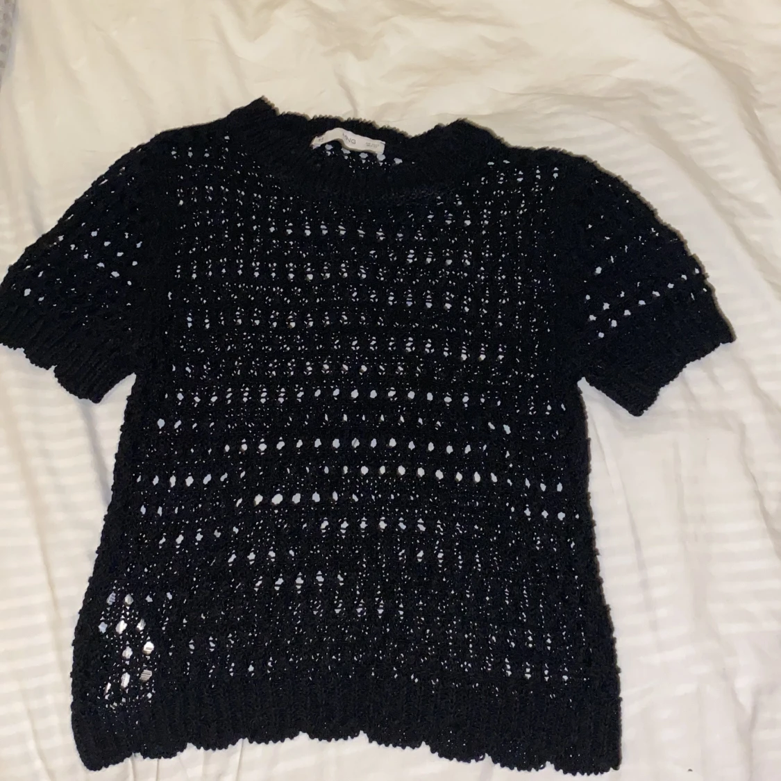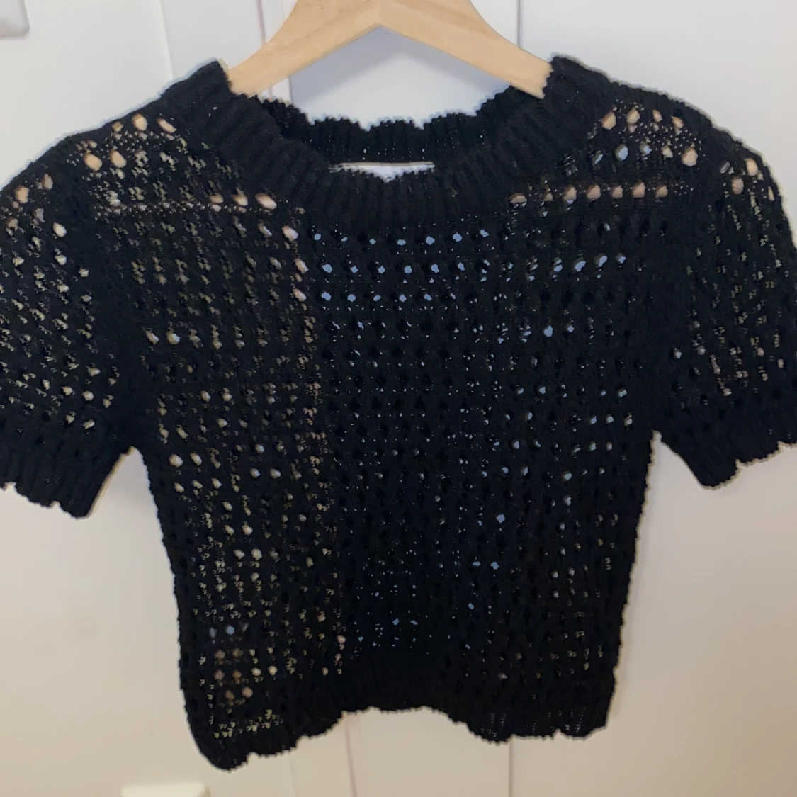 Säljer en svart stickad topp från mango. Den har ett öppet stickmönster och korta ärmar, perfekt för lager-på-lager eller som statement-plagg. Tillverkad i Turkiet. Passar bra till både jeans och kjol. 🖤