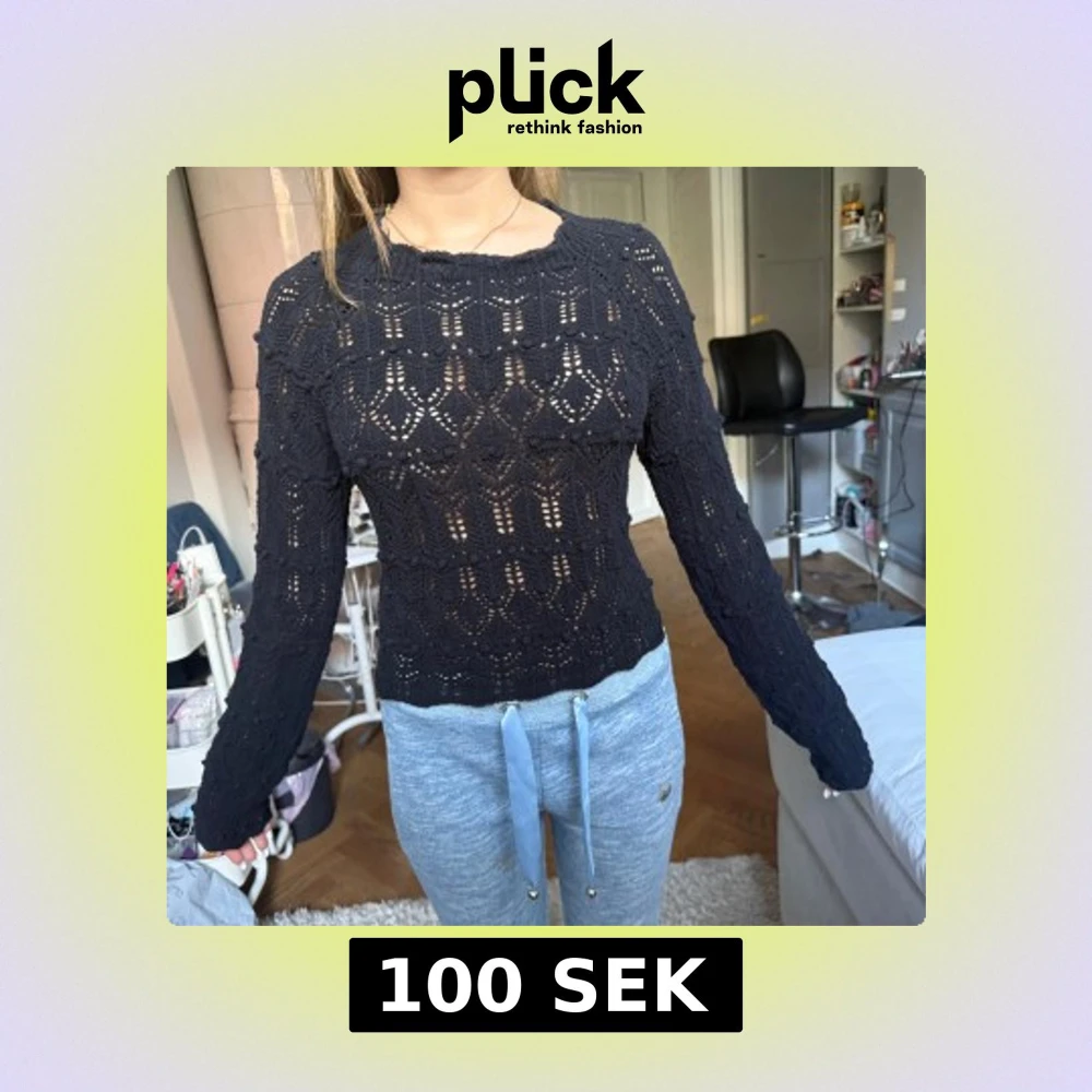 Snygg svart stickad topp med lång ärm och coolt hålmönster. Baksidan har en stor öppen rygg och knyt längst ner för extra detalj. Perfekt för dig som vill sticka ut med en unik och trendig look.