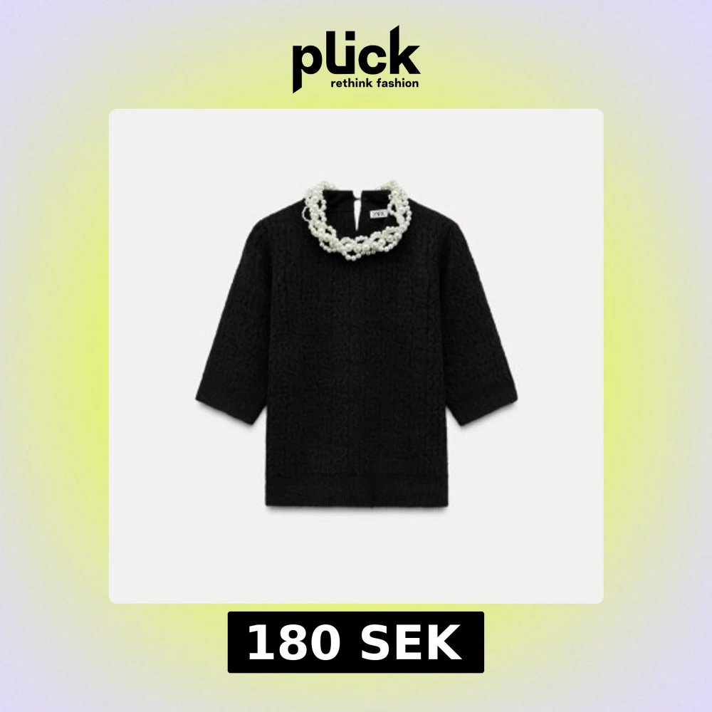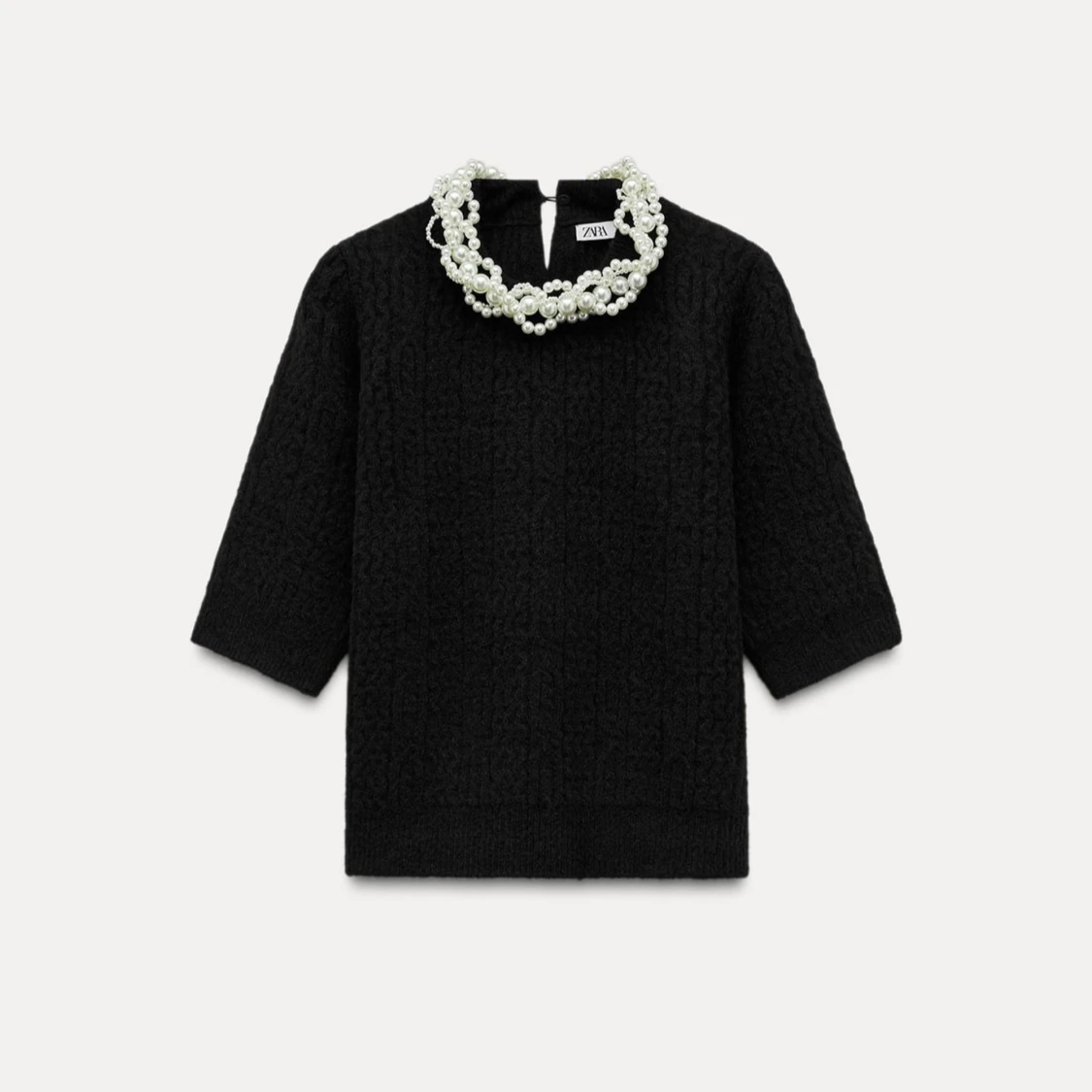 Säljer en svart stickad topp från Zara med trekvartsärm och en snygg pärlkedja runt halsen. Perfekt för dig som vill ha något extra till outfiten! Toppen har en rak passform och känns både trendig och elegant.
