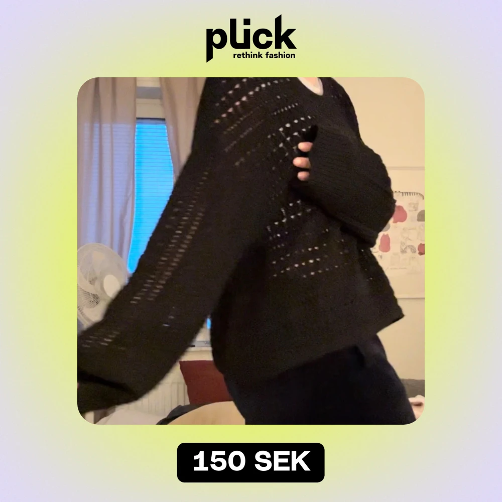 Säljer en svart stickad tröja med ett snyggt hålmönster. Den har en loose passform och långa ärmar, perfekt för höst och vinter. Tröjan är både stilren och bekväm, idealisk för lager-på-lager-stil. Passar till både jeans och kjol!
