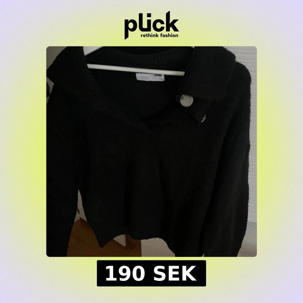 Säljer en svart stickad tröja med en unik krage och knapplösning. Tröjan har långa ärmar och en stilren design som passar perfekt för kyligare dagar. Perfekt för dig som vill ha något både bekvämt och snyggt! Storlek xs men passar även större storlekar!