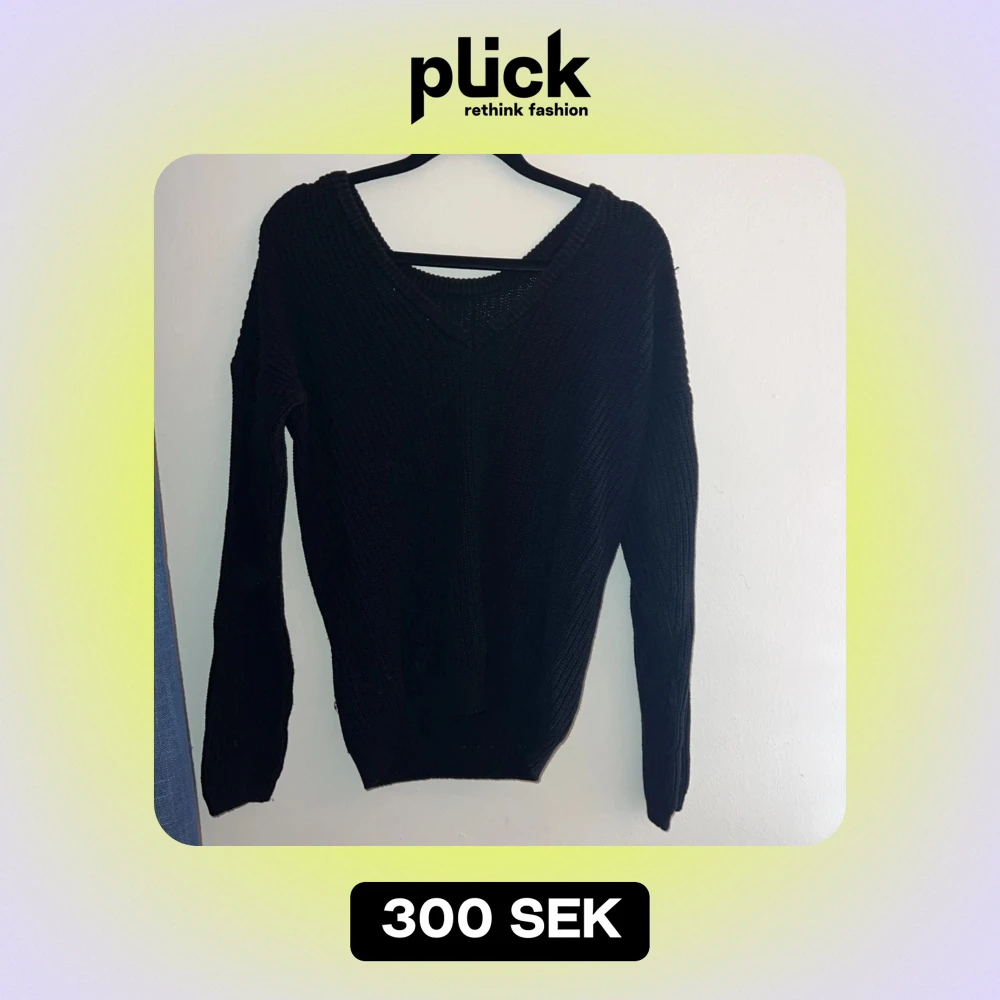 Säljer en svart stickad tröja i bra skick, storlek S. Den har en v-ringad hals och långa ärmar, men man kan även använda den åt andra hållet, perfekt för höst och vinter. Tröjan är mjuk och bekväm, idealisk för mysiga dagar. Passar till både jeans och kjol!