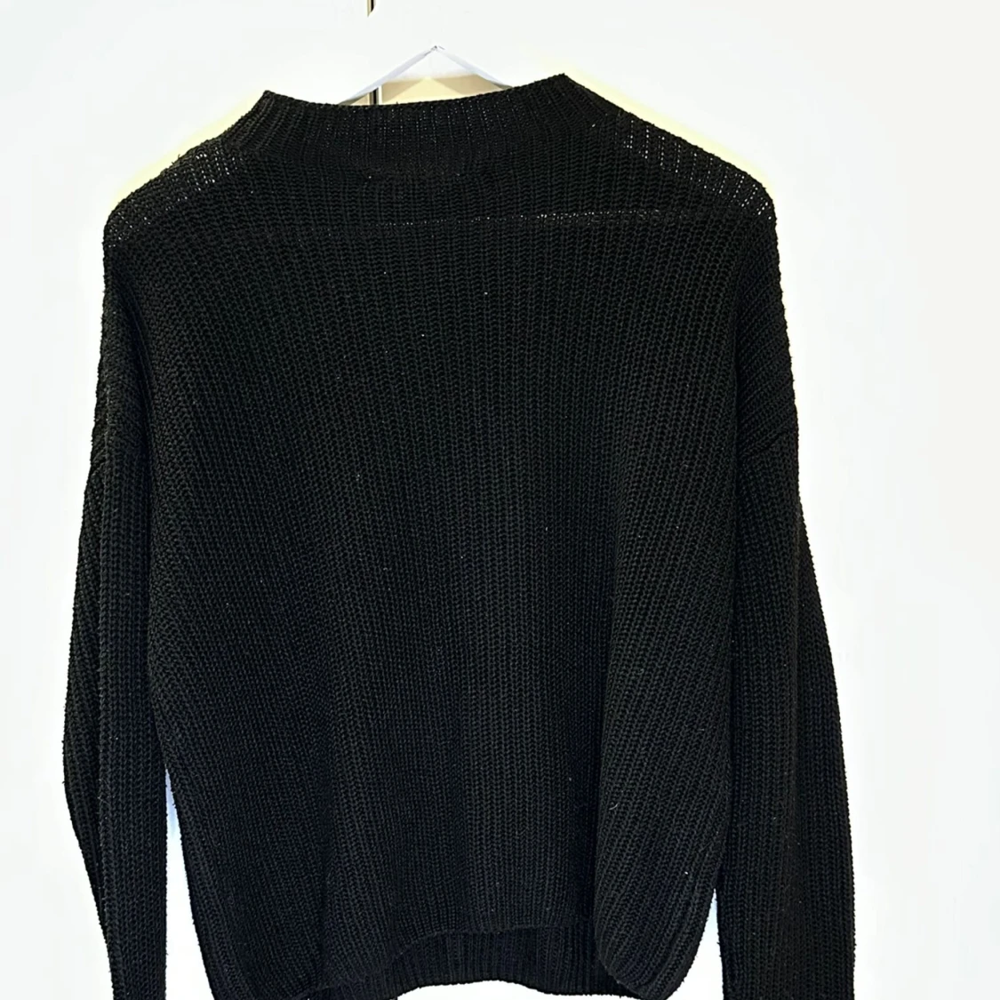 Säljer en stilren svart stickad tröja med rund hals och långa ärmar. Perfekt för kyligare dagar och enkel att matcha med olika outfits. Tröjan har en klassisk design med ribbade kanter.