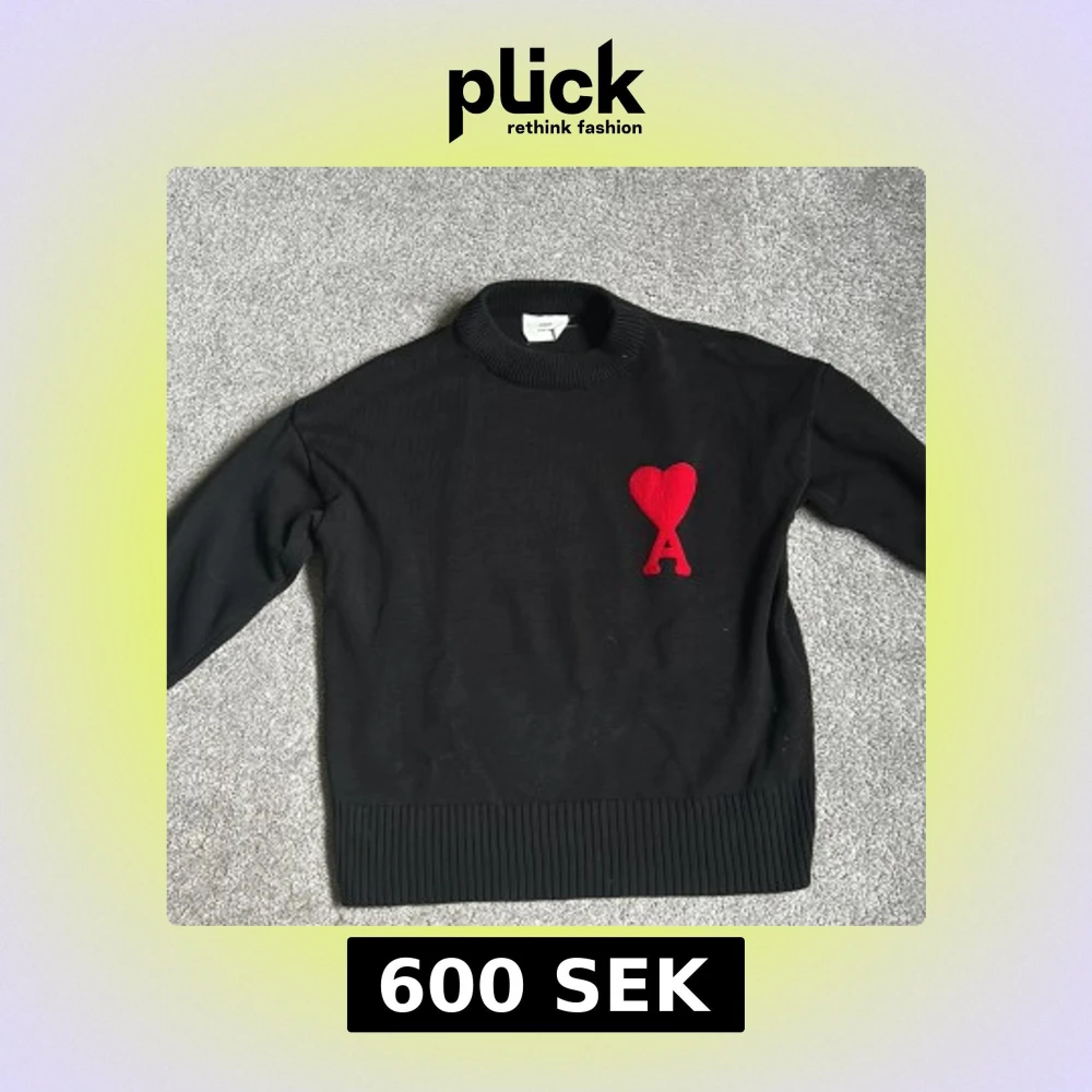 Säljer en svart stickad tröja från Ami med den klassiska hjärt broderingen. Tröjan är väldigt stilren, snygg och passar till vilken outfit som helst! Jag kan tyvärr inte verifiera äktheten på denna tröja eftersom jag köpte den på plick, därav det generösa priset. Annars är tröjan använd ett par gånger men utan några defekter. Hör av dig vid några frågor! Köparen står för frakt.