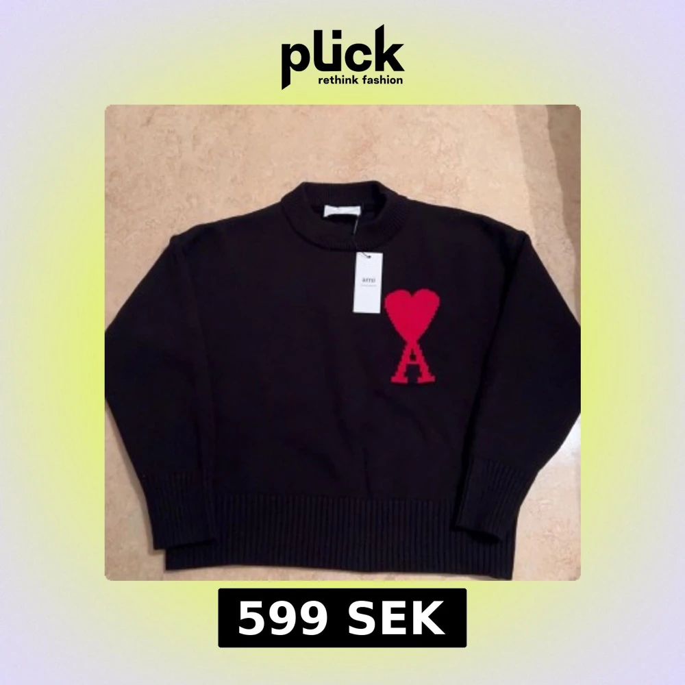 Säljer en snygg svart stickad tröja från Ami med ett rött hjärta och bokstaven A på bröstet. Tröjan har en ribbad krage och långa ärmar. Perfekt för att hålla sig varm och stilren.