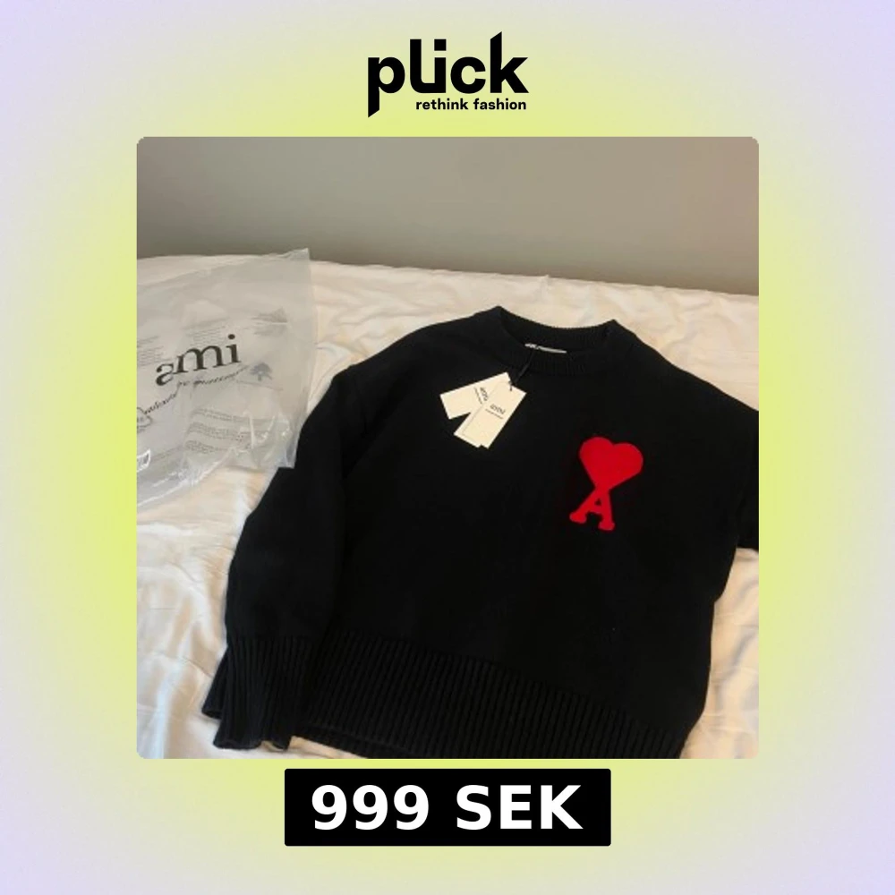 Svart stickad tröja från Ami Alexandre Mattiussi med röd hjärtformad A-logga på bröstet. Tröjan har rund hals, ribbade muddar och är långärmad. Materialet är mjuk ull som känns riktigt skönt mot huden. Perfekt för dig som gillar stilrena detaljer och snygg design.