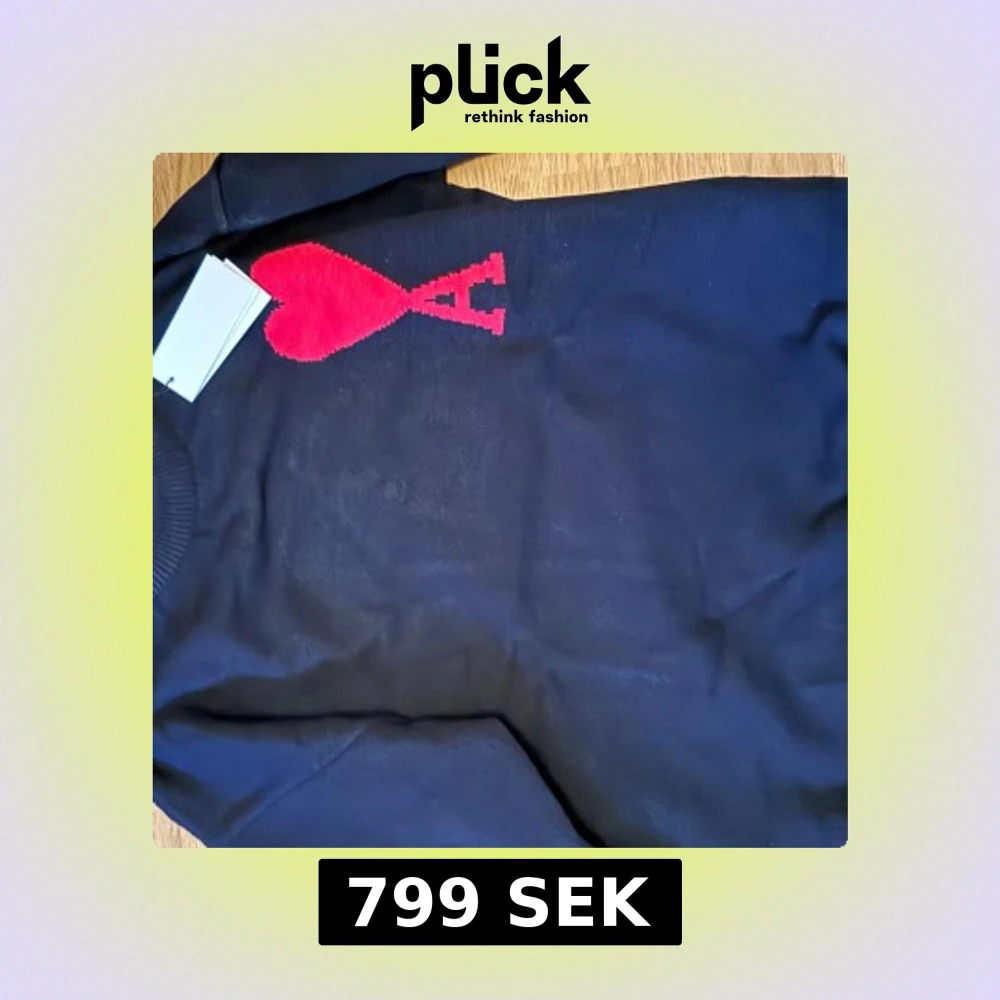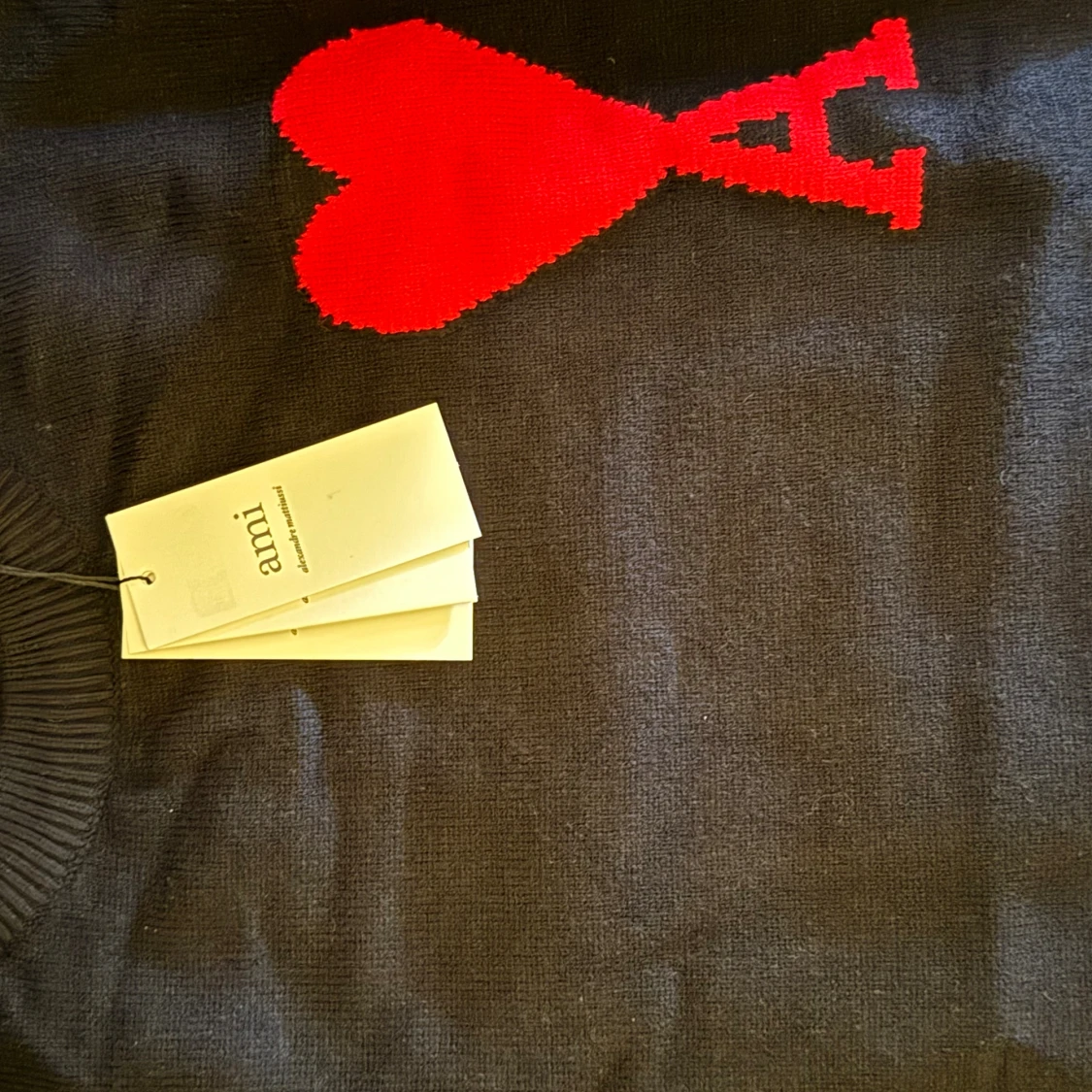 Svart stickad tröja från Ami med röd hjärtlogga och bokstaven A på bröstet. Tröjan har ribbad krage och är perfekt för dig som gillar stilrena plagg med en twist. Materialet är mjukt och passar bra till kyligare dagar.