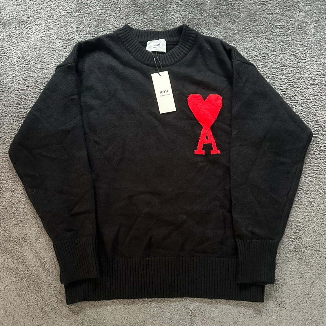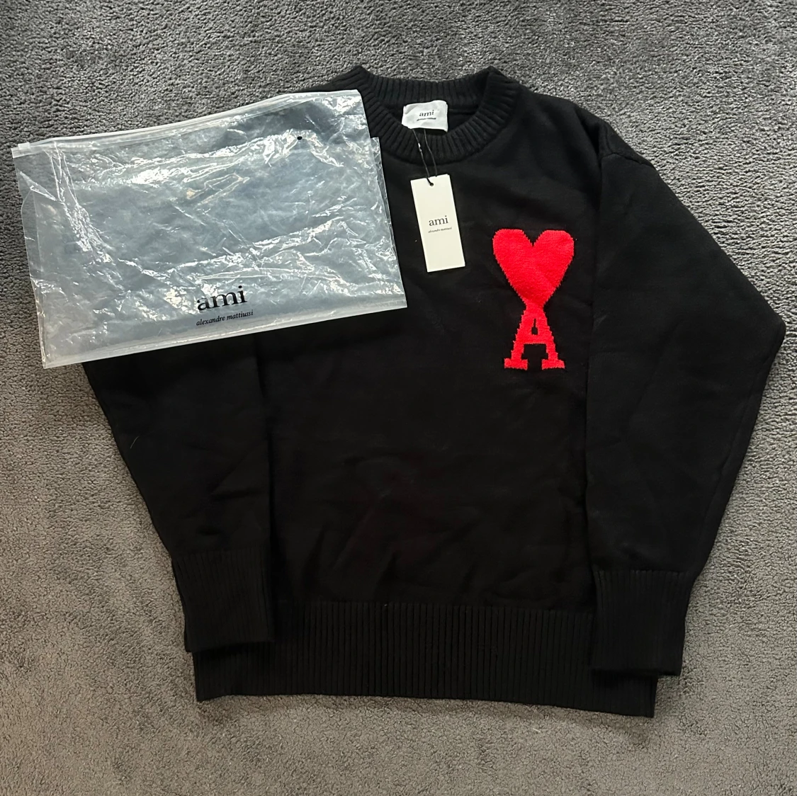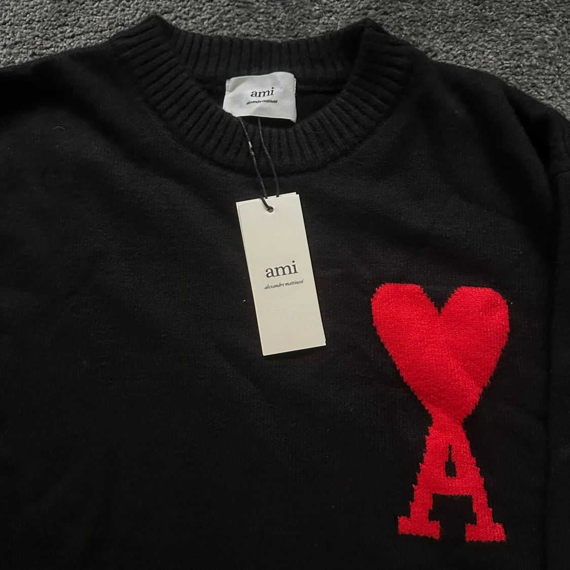 Svart stickad tröja från Ami Alexandre Mattiussi med ett stort rött hjärta och bokstaven A broderat på bröstet. Tröjan har rund hals, ribbade muddar och nederkant samt långärmad passform. Perfekt för dig som gillar stilrena detaljer med en twist.