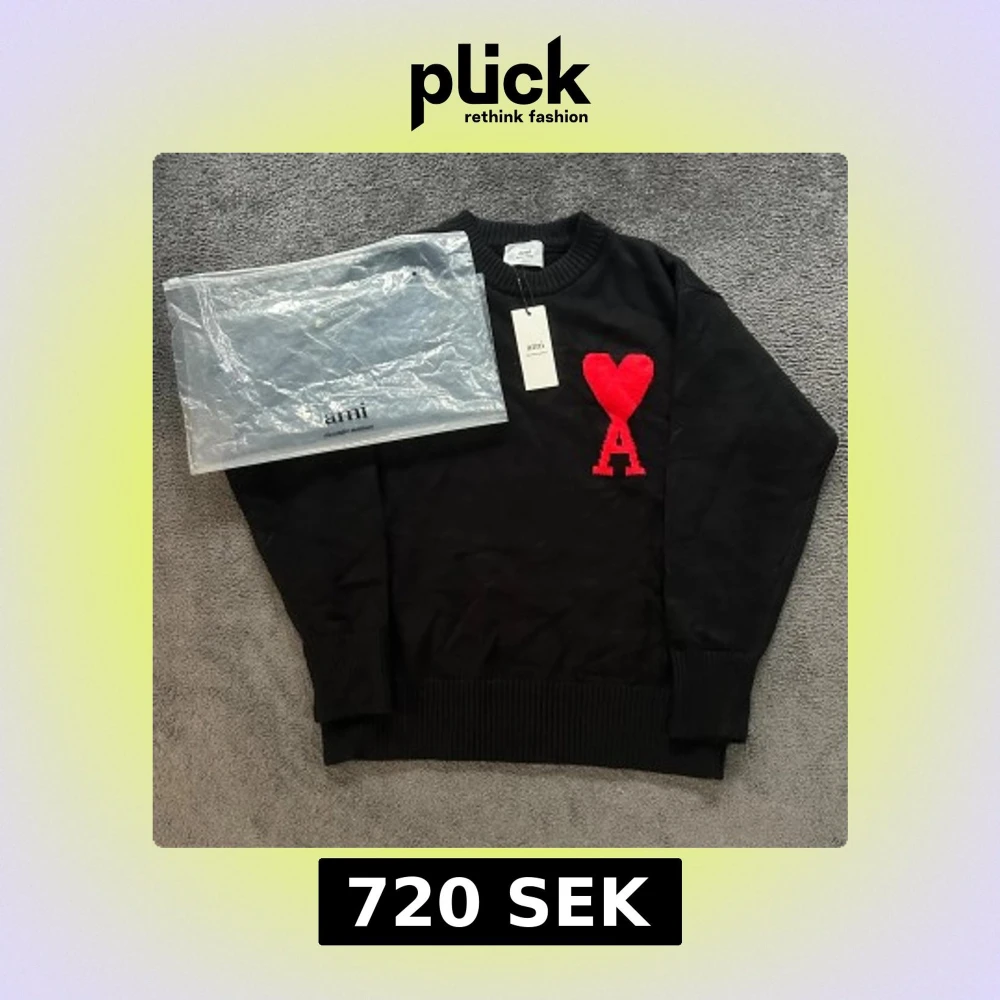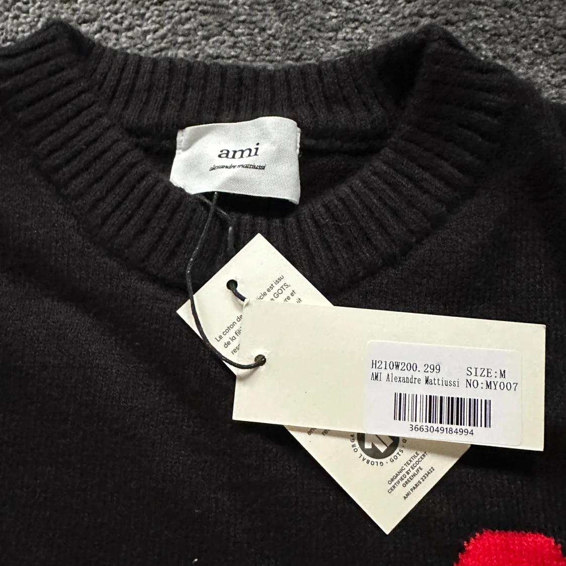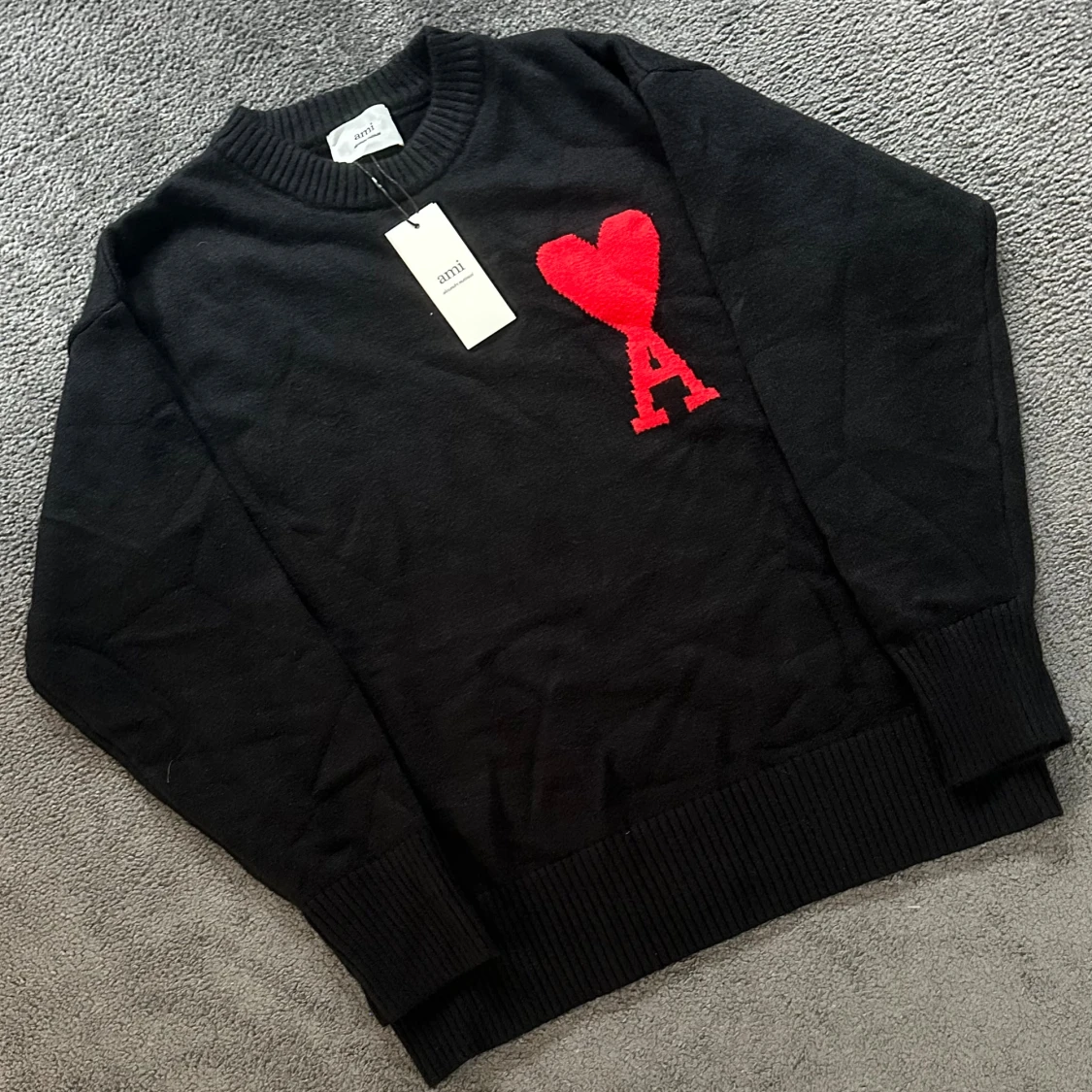 Svart stickad tröja från Ami Alexandre Mattiussi med ett stort rött hjärta och bokstaven A broderat på bröstet. Tröjan har rund hals, ribbade muddar och nederkant samt långärmad passform. Perfekt för dig som gillar stilrena detaljer med en twist.