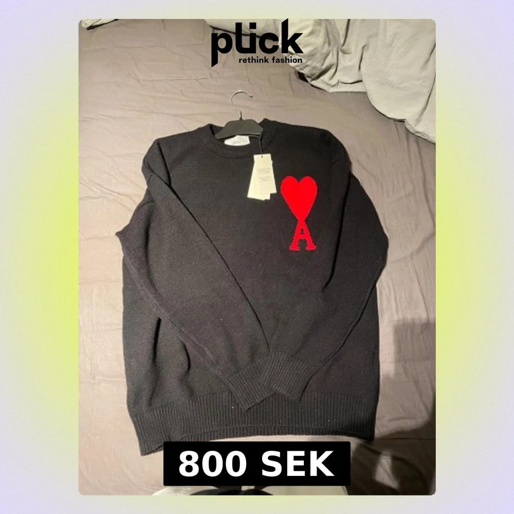 Svart stickad tröja från Ami Paris med röd hjärtapplikation och bokstaven A på bröstet. Rund hals, ribbade muddar och långärmad. Tröjan är tillverkad i Portugal och har en clean, klassisk look med snygg detalj framtill.