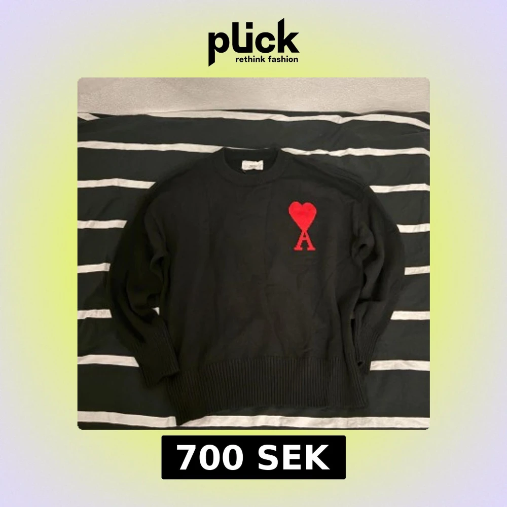 Svart stickad tröja från Ami Paris med rund halsringning och ett stort rött hjärta med bokstaven A broderat på bröstet. Tröjan har långa ärmar och bred ribbstickning vid ärmslut och nederkant. Perfekt för dig som gillar stilrena plagg med en twist. Kontakta för mer information.