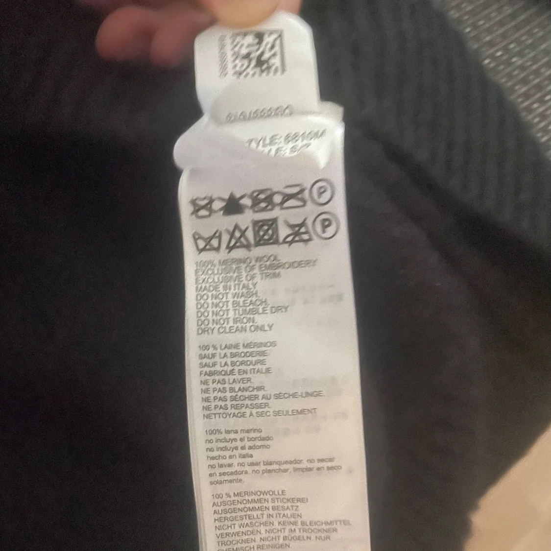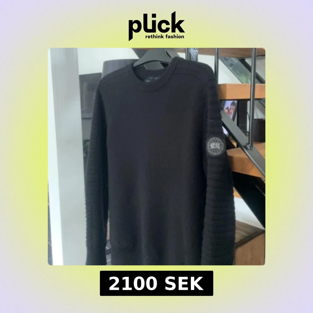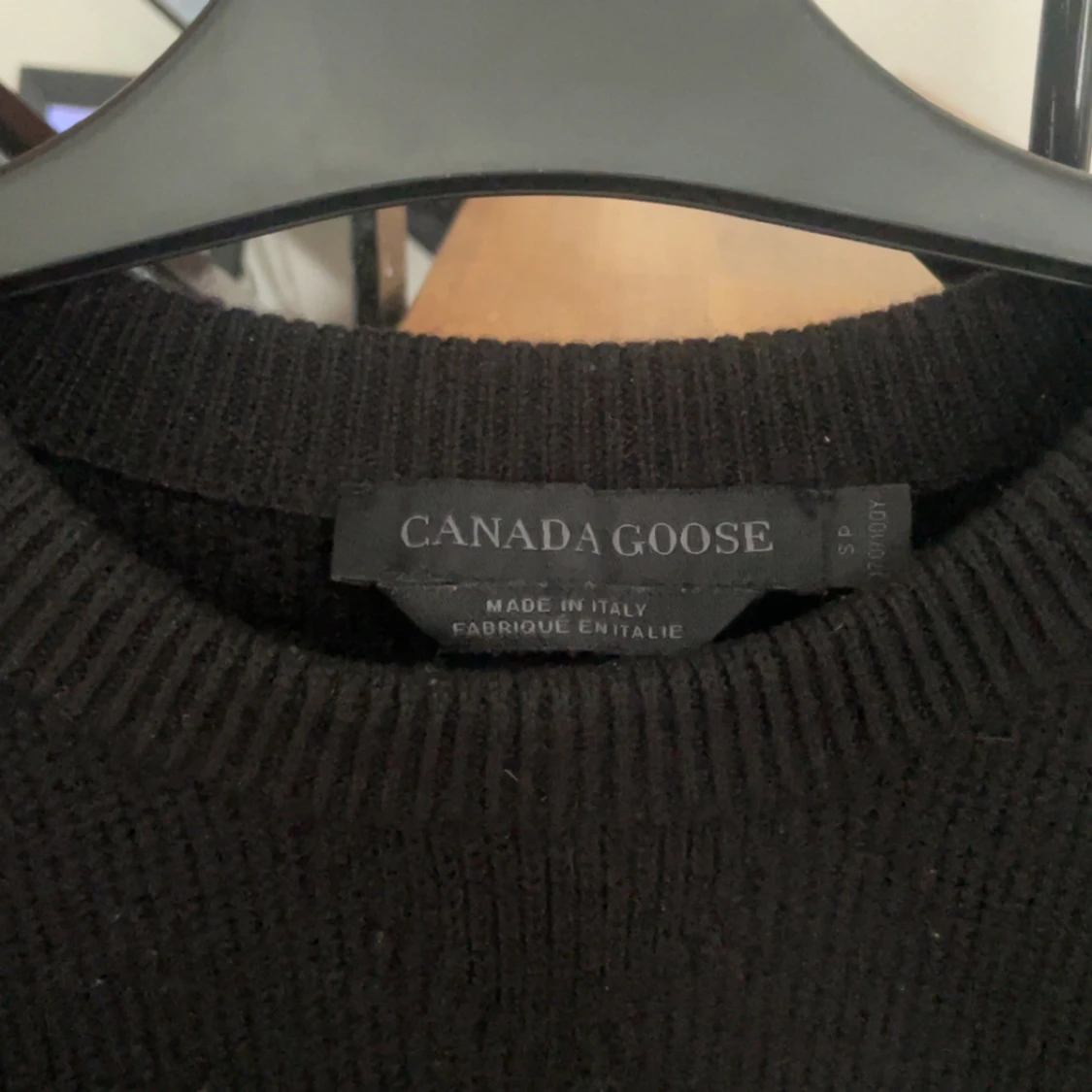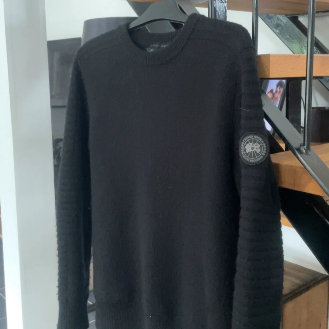 Svart stickad tröja från Canada Goose i 100% merinoull. Klassisk rund halsringning och ribbade muddar. Snygg patch med logga på ena ärmen. Perfekt för kyliga dagar och riktigt skön att ha på sig.