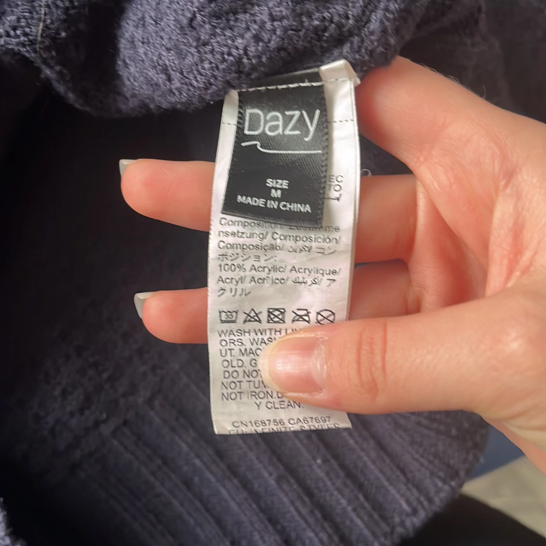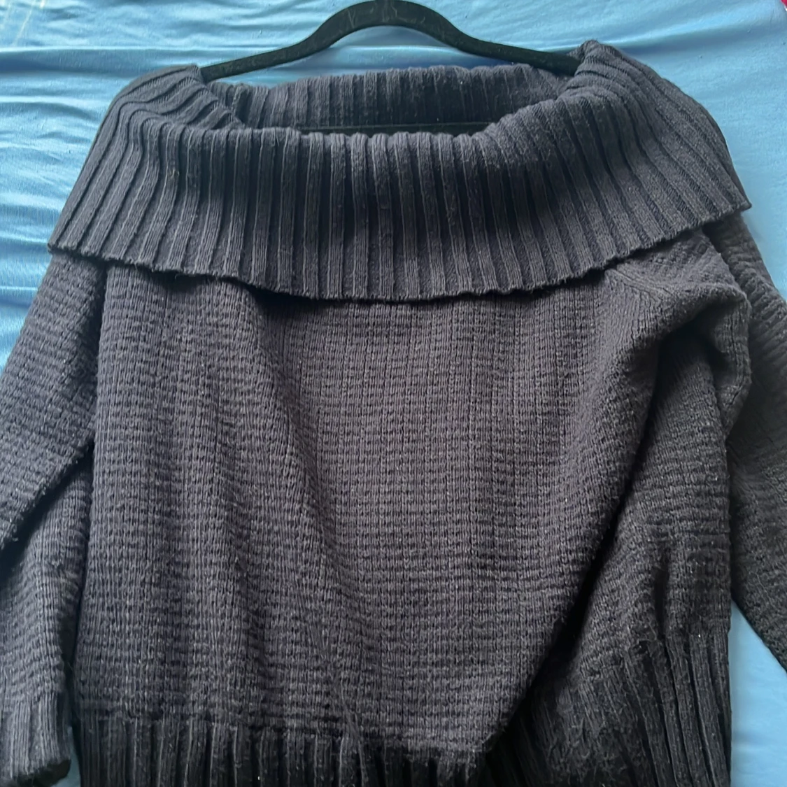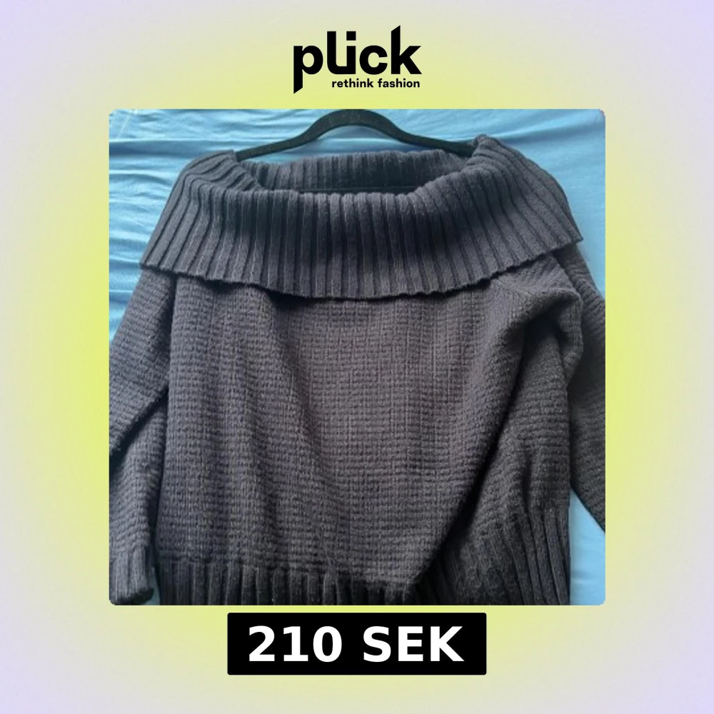 Svart stickad tröja från Dazy i storlek M med bred ribbad krage som kan bäras offshoulder. Tröjan har grovstickad struktur och ribbade muddar vid ärmslut och nederkant. Perfekt för dig som gillar chill och stilren vibe.