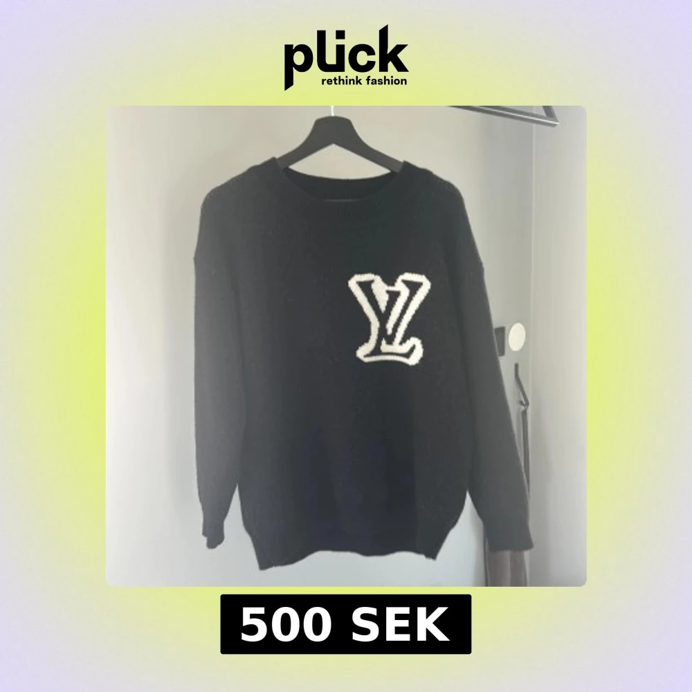 Säljer en svart stickad tröja från Louis Vuitton med stort vitt LV-logo på bröstet. Tröjan har rund halsringning och långa ärmar. Perfekt för dig som gillar exklusiva och stilrena plagg.