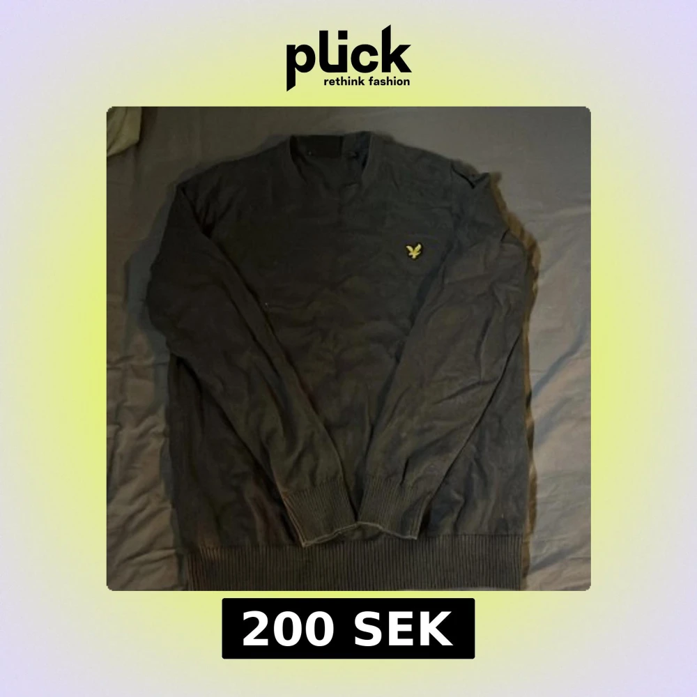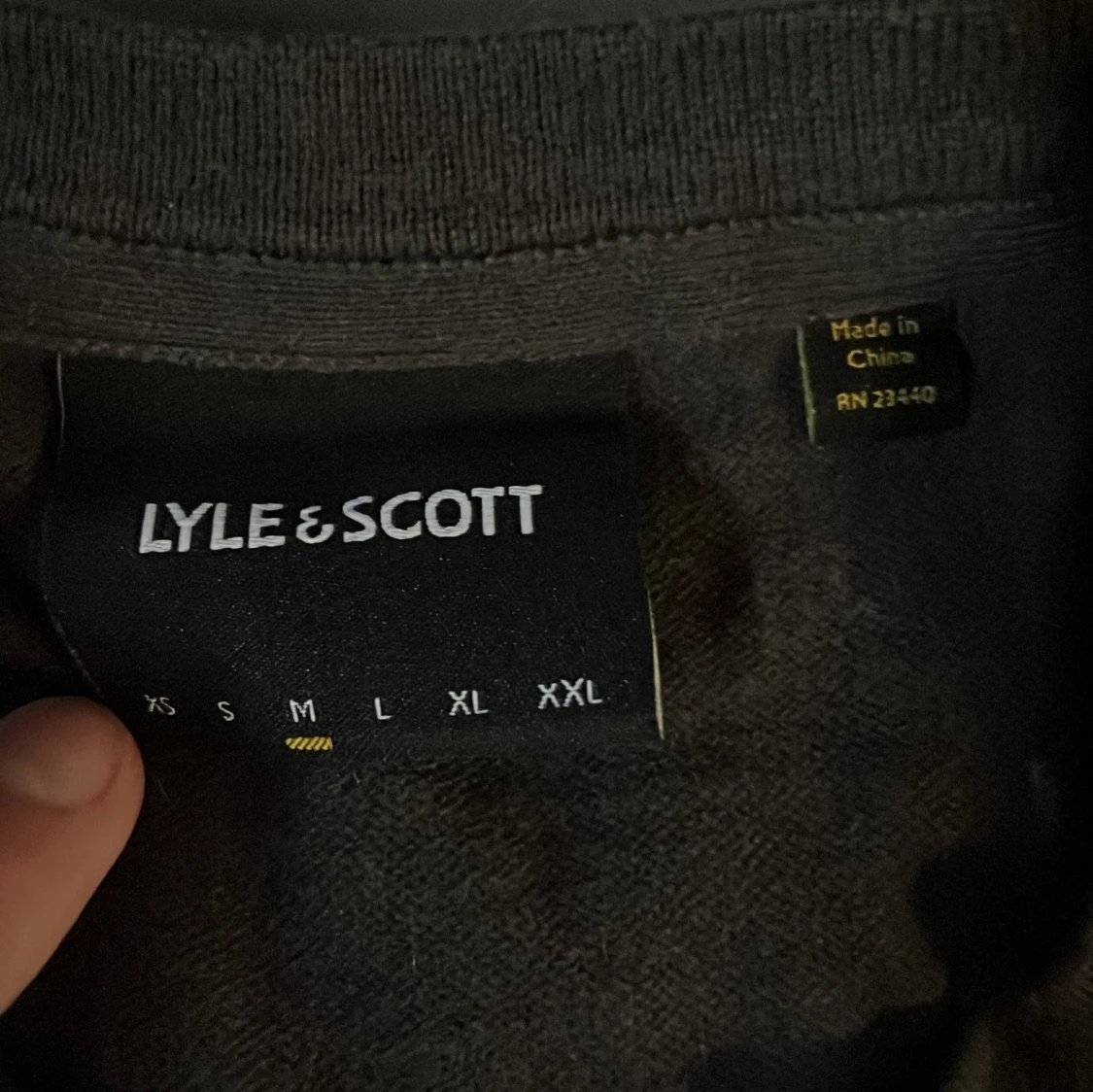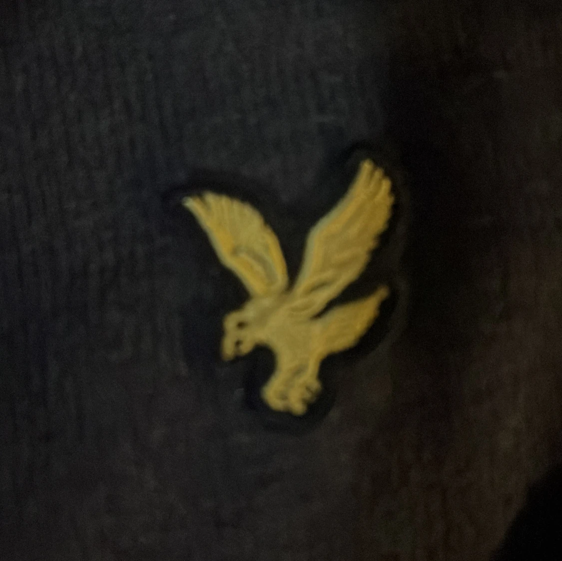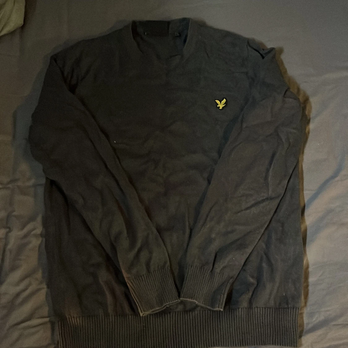 Svart stickad tröja från Lyle & Scott i storlek M. Klassisk modell med rund halsringning, ribbade muddar och nederkant. På bröstet finns den ikoniska gula örnloggan broderad. Perfekt för dig som gillar stilrena och tidlösa plagg.