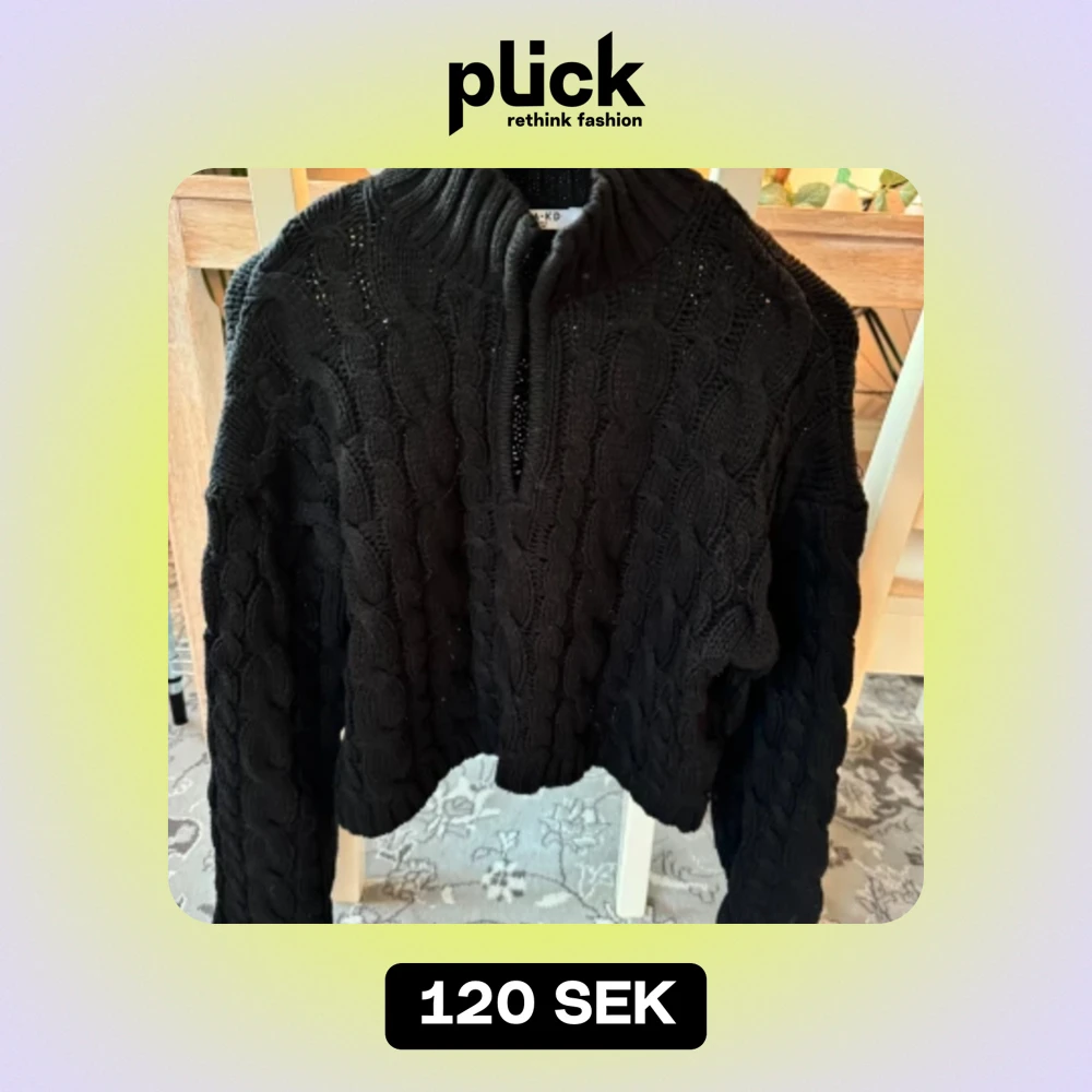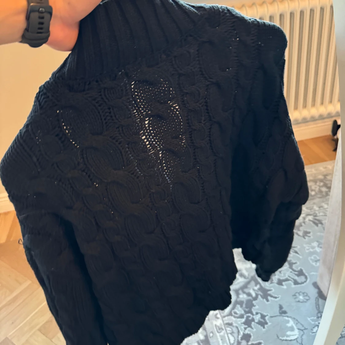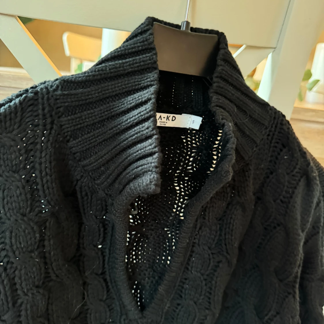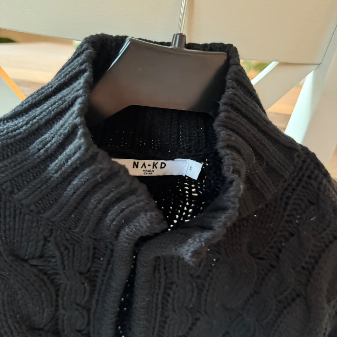 Säljer en supermysig svart stickad tröja från NA-KD. Den har ett snyggt flätmönster och en djup v-ringning som ger en cool look. Perfekt för höst och vinter när du vill hålla dig varm och stilren. Tröjan är i storlek S och är i nyskick. Perfekt för både vardag och fest!