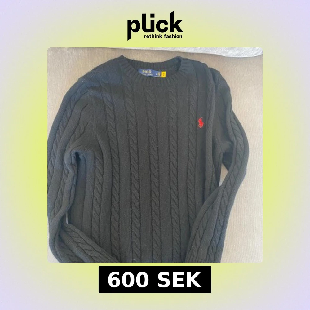 Säljer en stilren svart stickad tröja från Polo Ralph Lauren med kabelstickat mönster och röd logotyp på bröstet. Tröjan har långa ärmar och ribbstickade muddar. Perfekt för kyliga dagar!