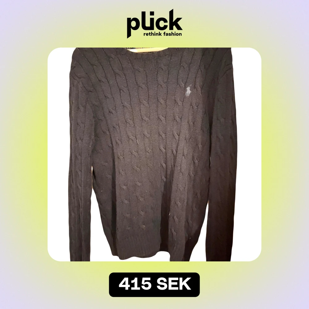 Säljer en snygg svart stickad tröja från Polo Ralph Lauren. Den har ett klassiskt kabelstickat mönster och en liten broderad logga på bröstet. Perfekt för både höst och vinter, med långa ärmar och ribbade kanter. Passar till både vardag och fest!