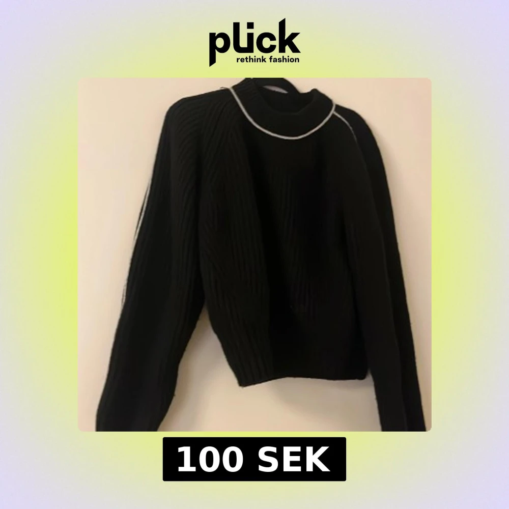 Snygg svart stickad tröja med vita detaljer runt halsen och längs ärmarna. Perfekt för kyliga dagar med sin höga krage och långa ärmar. En stilren och bekväm tröja för alla tillfällen.
