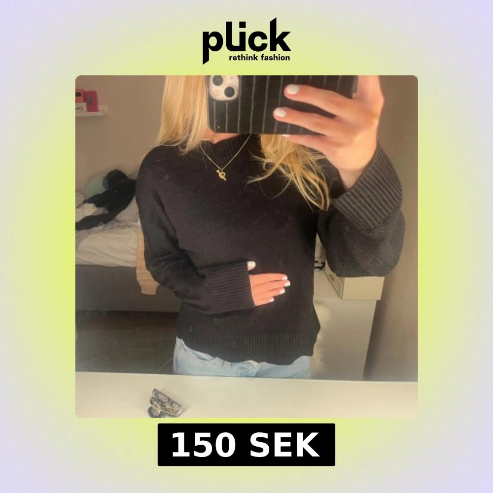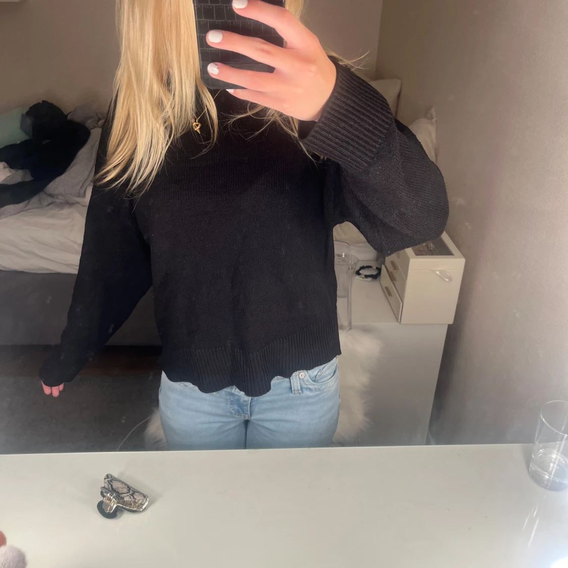 En svart stickad tröja med rund hals och breda ribbade muddar vid ärmslut och nederkant. Tröjan har en avslappnad passform och är långärmad, perfekt att matcha med jeans för en enkel och stilren look.