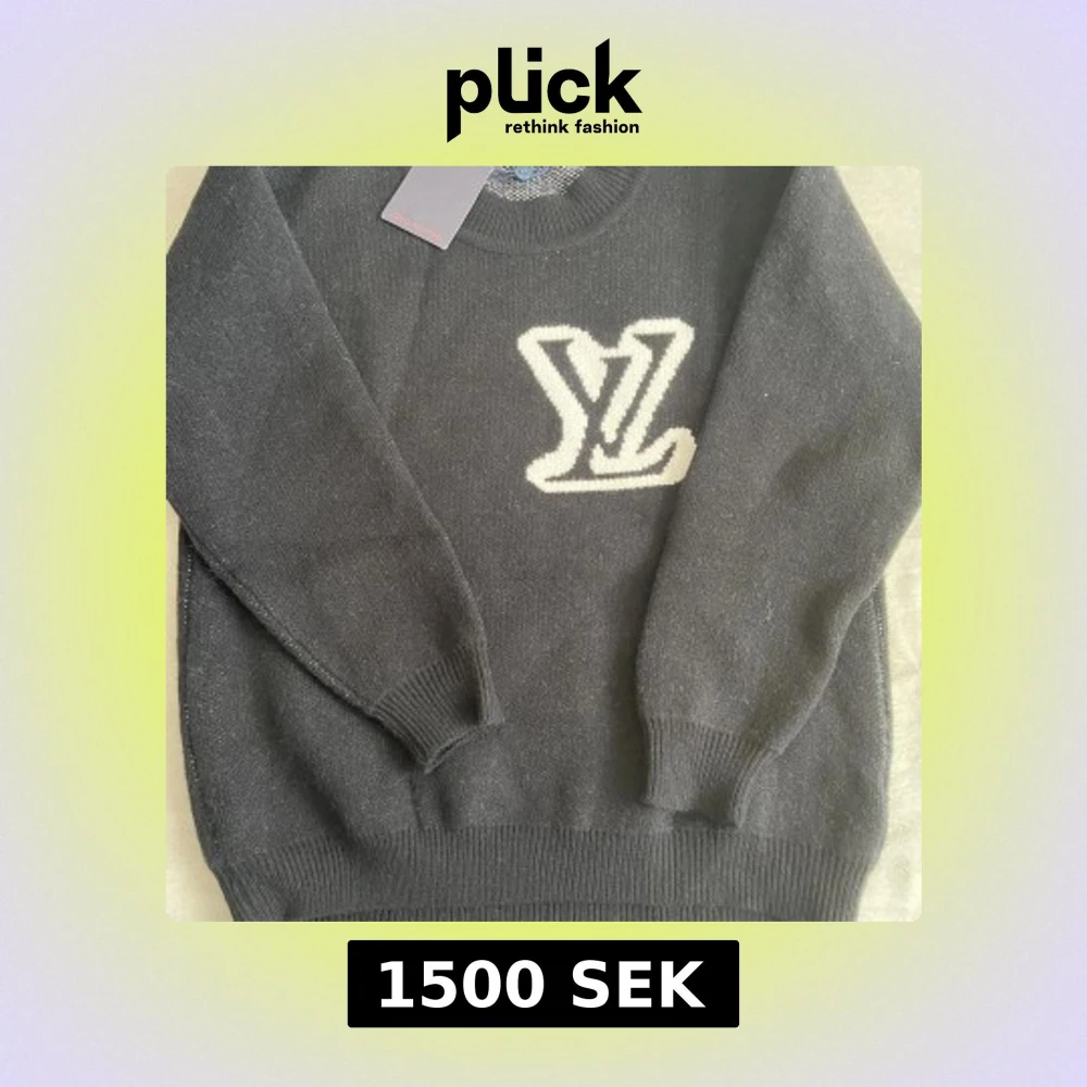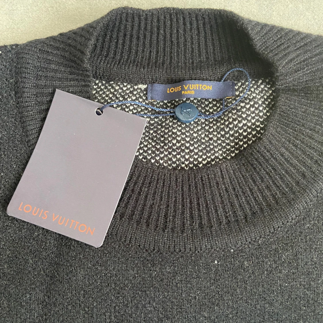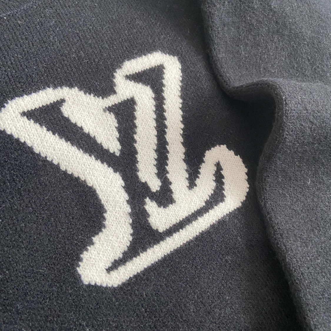 Svart stickad tröja från Louis Vuitton med stort vitt LV-logo på bröstet. Tröjan har rund halsringning, ribbade muddar och är långärmad. Perfekt för dig som vill ha en lyxig och stilren look med exklusiv känsla.