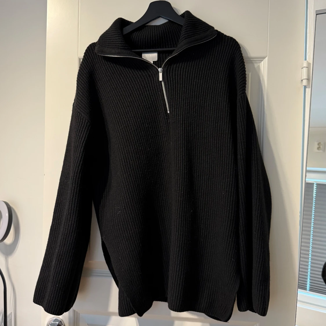Svart stickad tröja med halv dragkedja framtill och hög krage. Tröjan har lång ärm och en avslappnad passform, perfekt för kyligare dagar.