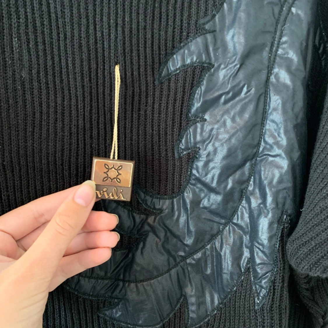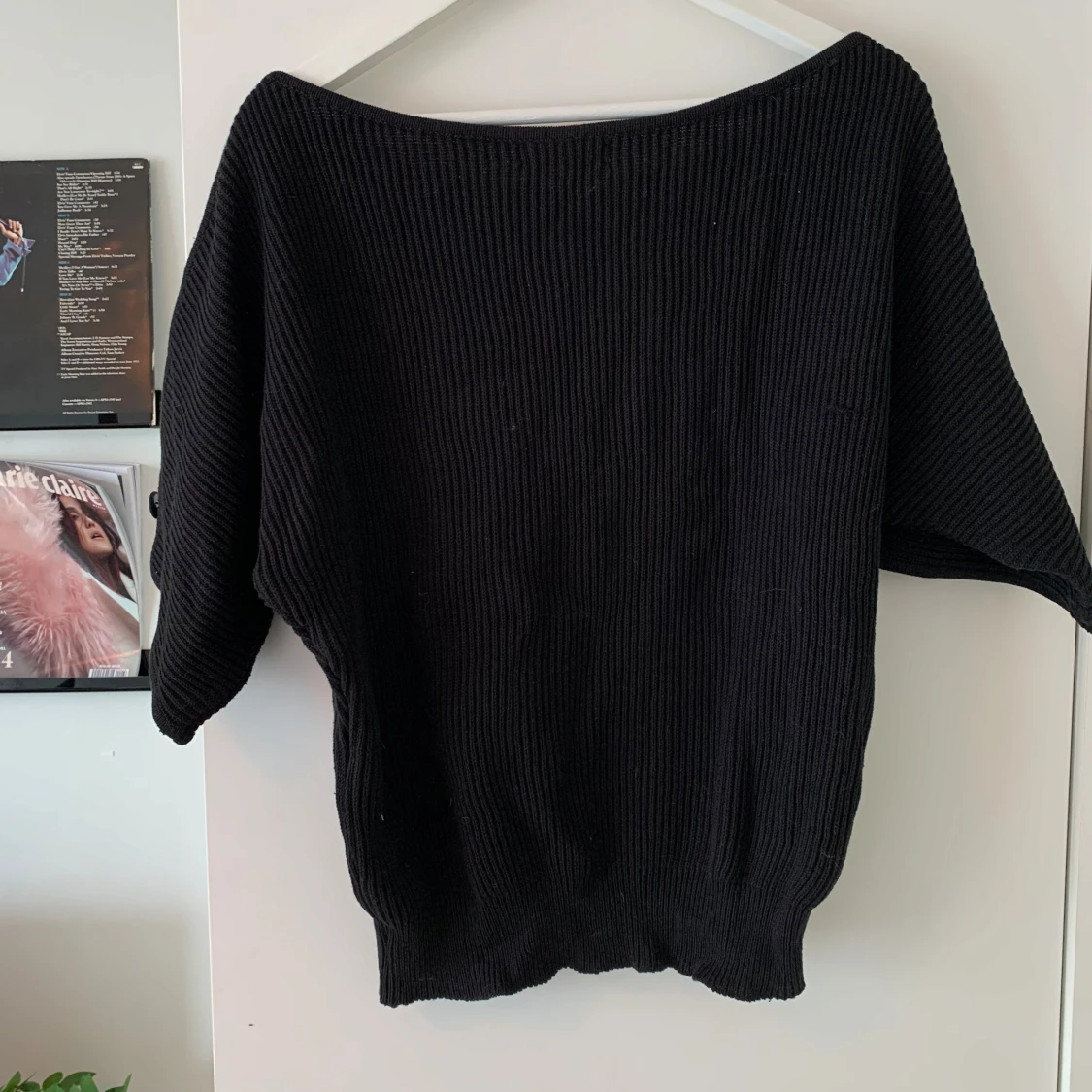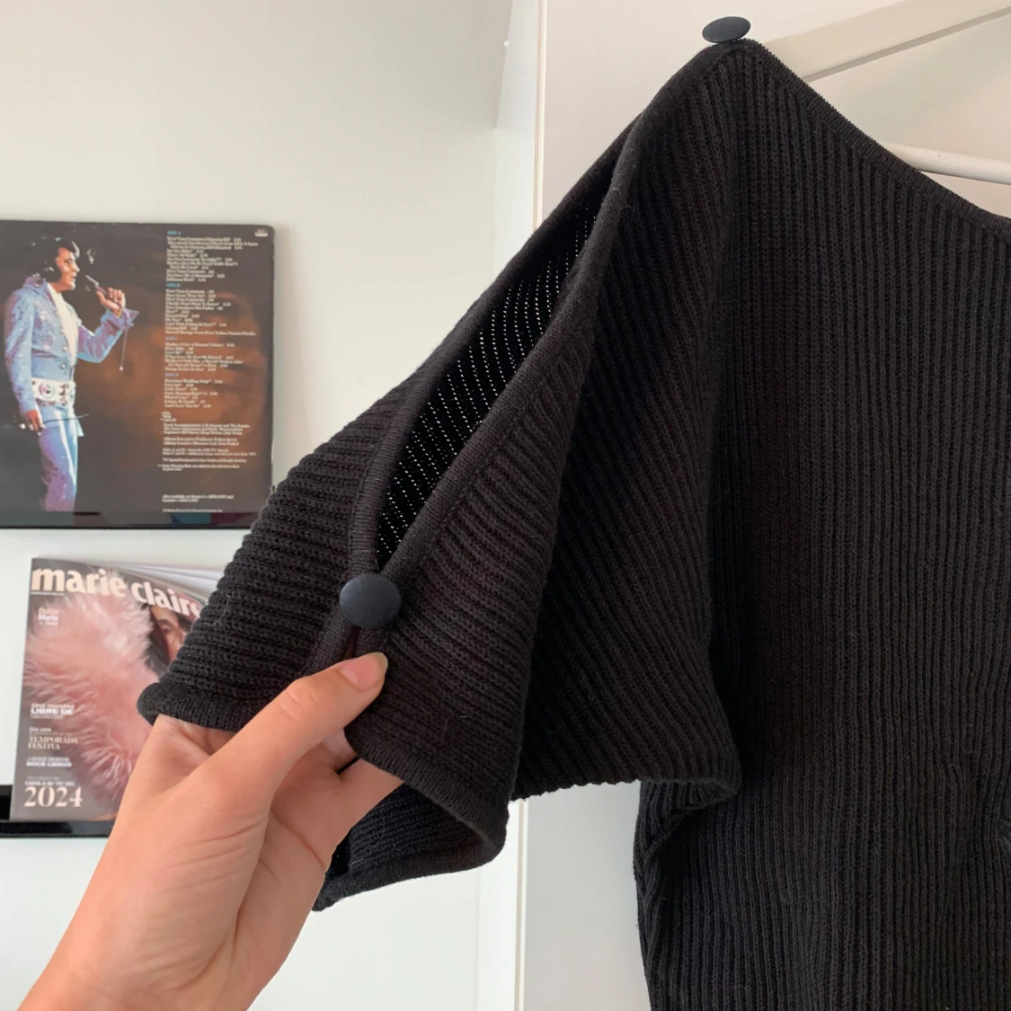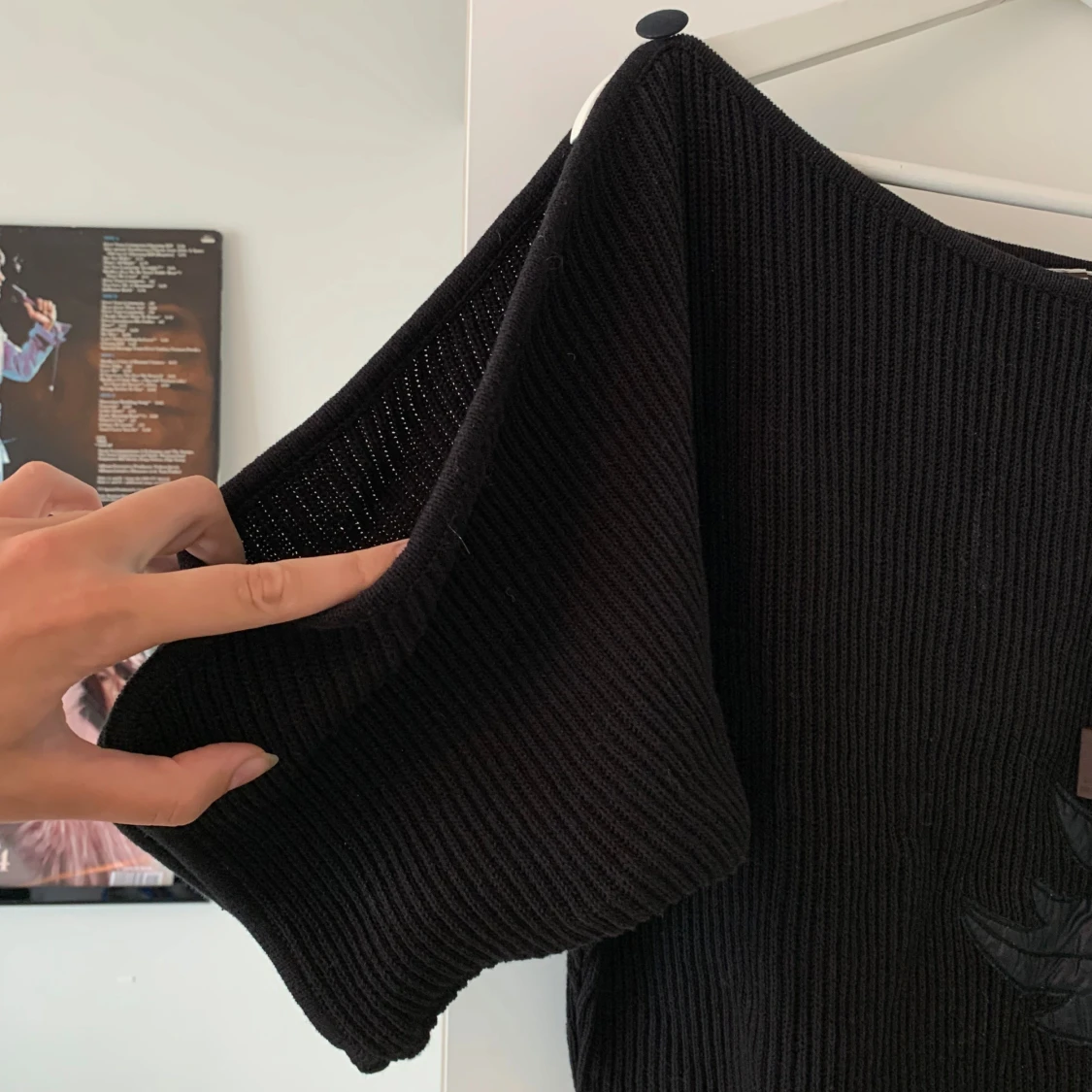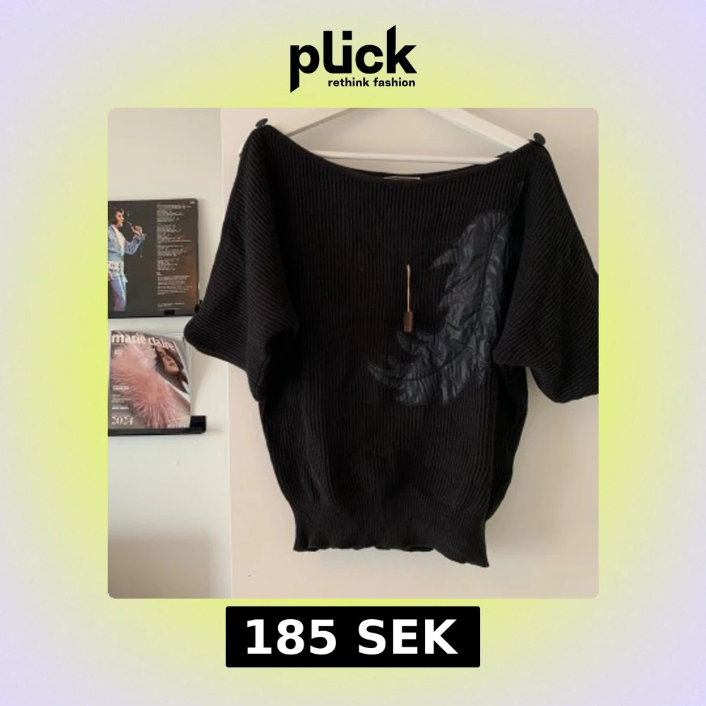 Svart stickad tröja med bred halsringning och korta ärmar som kan knäppas med knapp. På framsidan finns en stor fjäderdetalj i glansigt tyg. Tröjan har en loose passform och ribbad struktur, perfekt för dig som gillar unika detaljer.