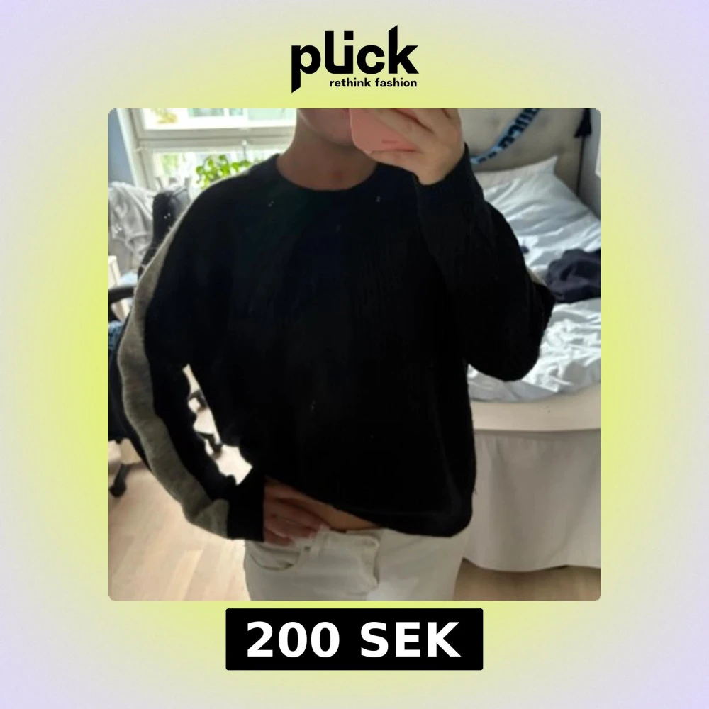 Säljer en blå stickad tröja med en grå rand längs ärmarna. Tröjan har en avslappnad passform och är långärmad med rund hals.
