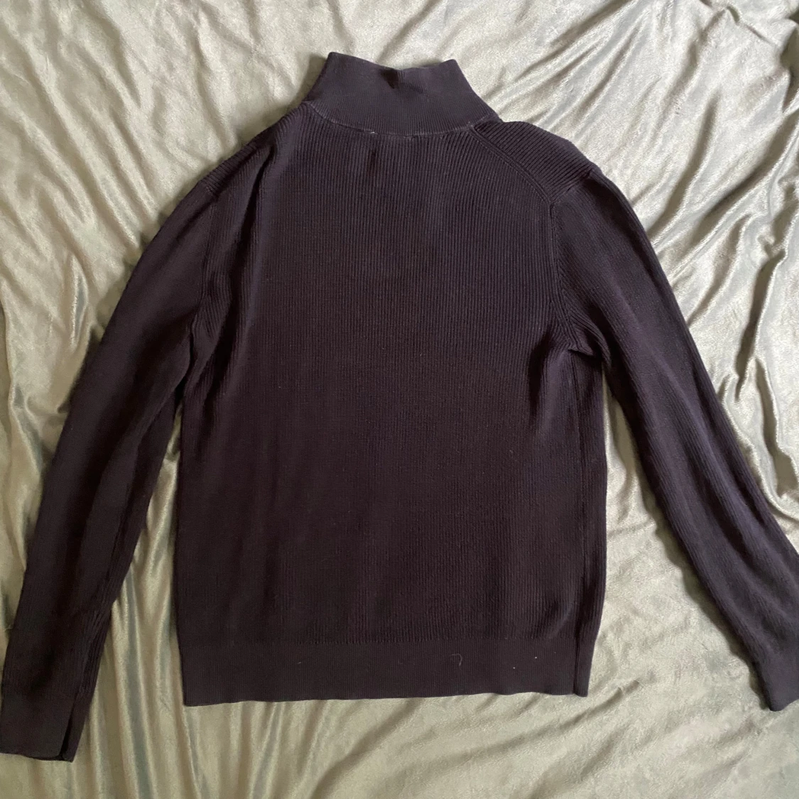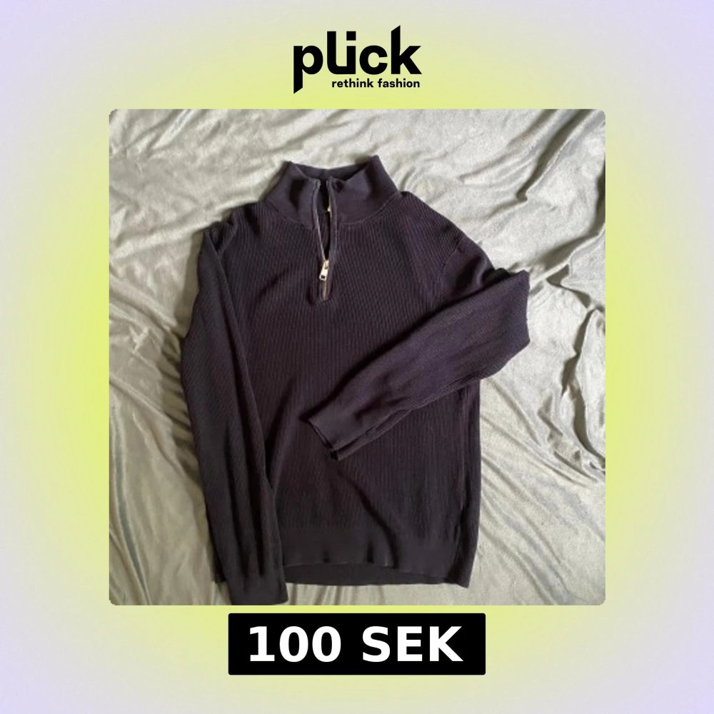 Mörk, stickad tröja i svart med hög krage och half zip-dragkedja framtill. Tröjan har lång ärm och ribbad struktur, perfekt för lager-på-lager under kyliga dagar.