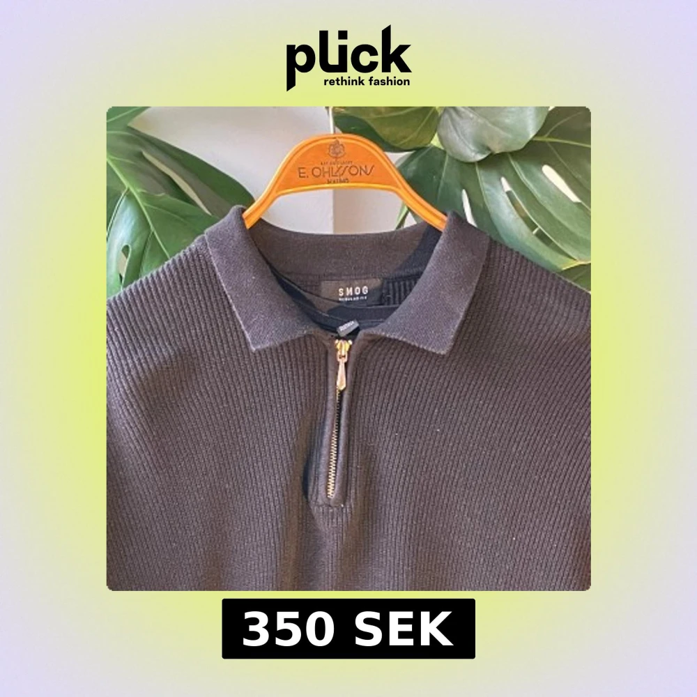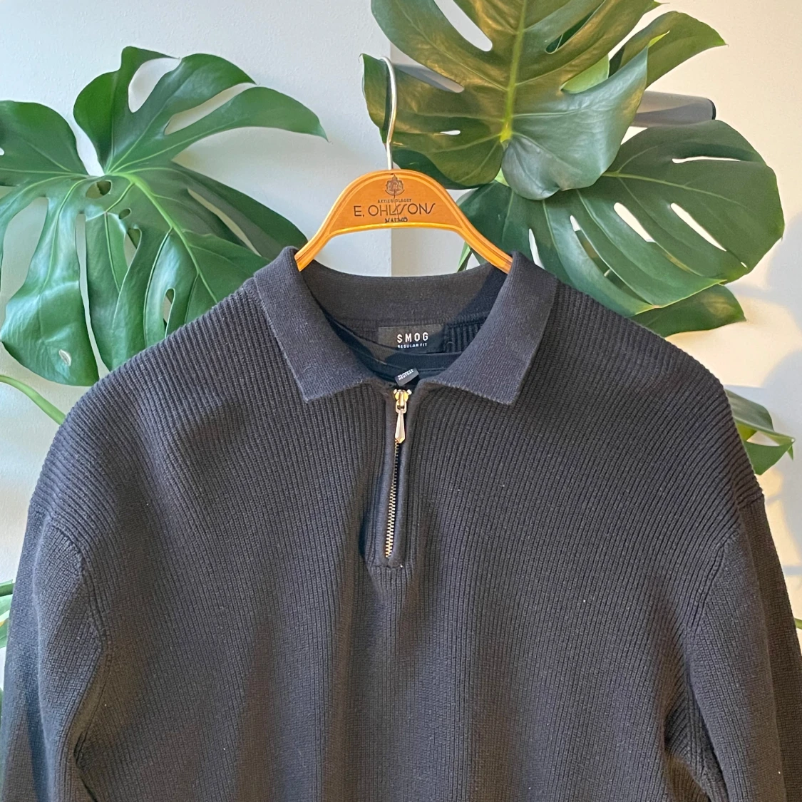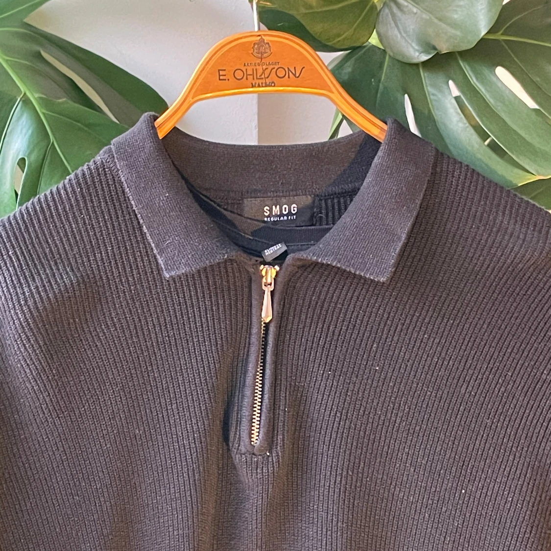 Svart stickad tröja från SMOG med klassisk krage och halv dragkedja framtill. Tröjan har ribbad struktur och lång ärm, perfekt för lager-på-lager under kyliga dagar. Enkel och stilren design som funkar till det mesta.